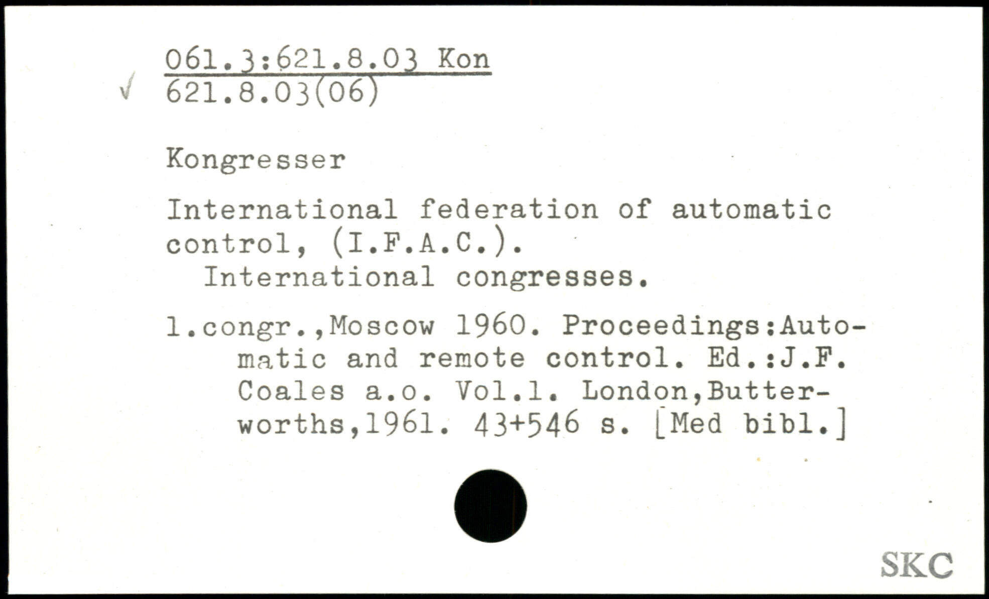 International federation of automatic control, (I.F.A.C.). International congresses. 1.congr.,Moscow 1960. Proceedings:Automatic and remote control. Ed.gJ.F. Coales a.o.