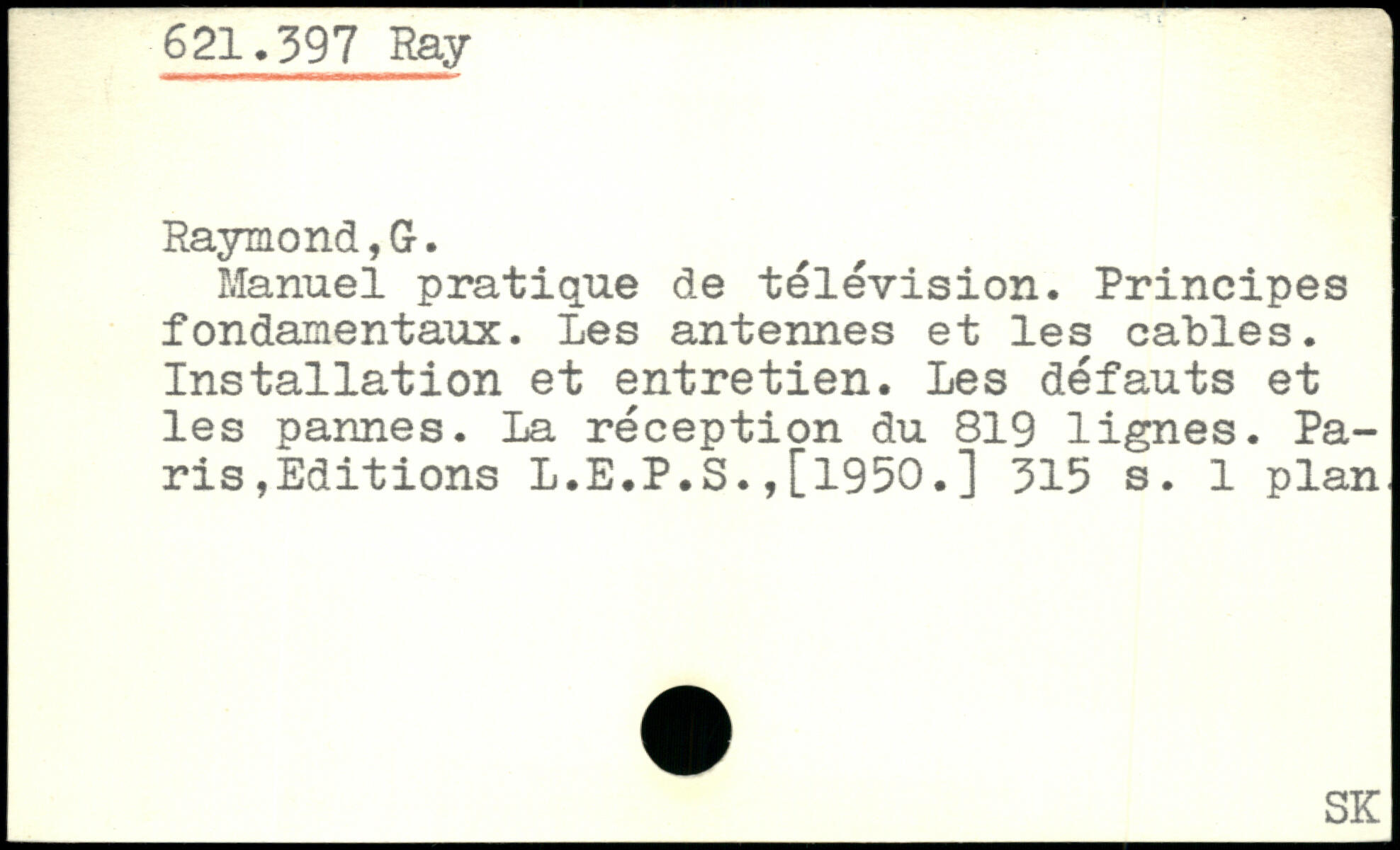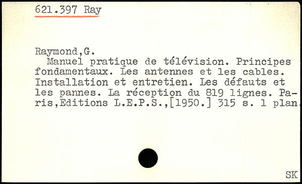 Manuel pratique de télévision. Principes fondamentaux, les antennes et les cables. Installation et entretien. Les défauts et les pannes. La réception du 819 lignes. Paris,Editions L.E.P.S.,[1950.]