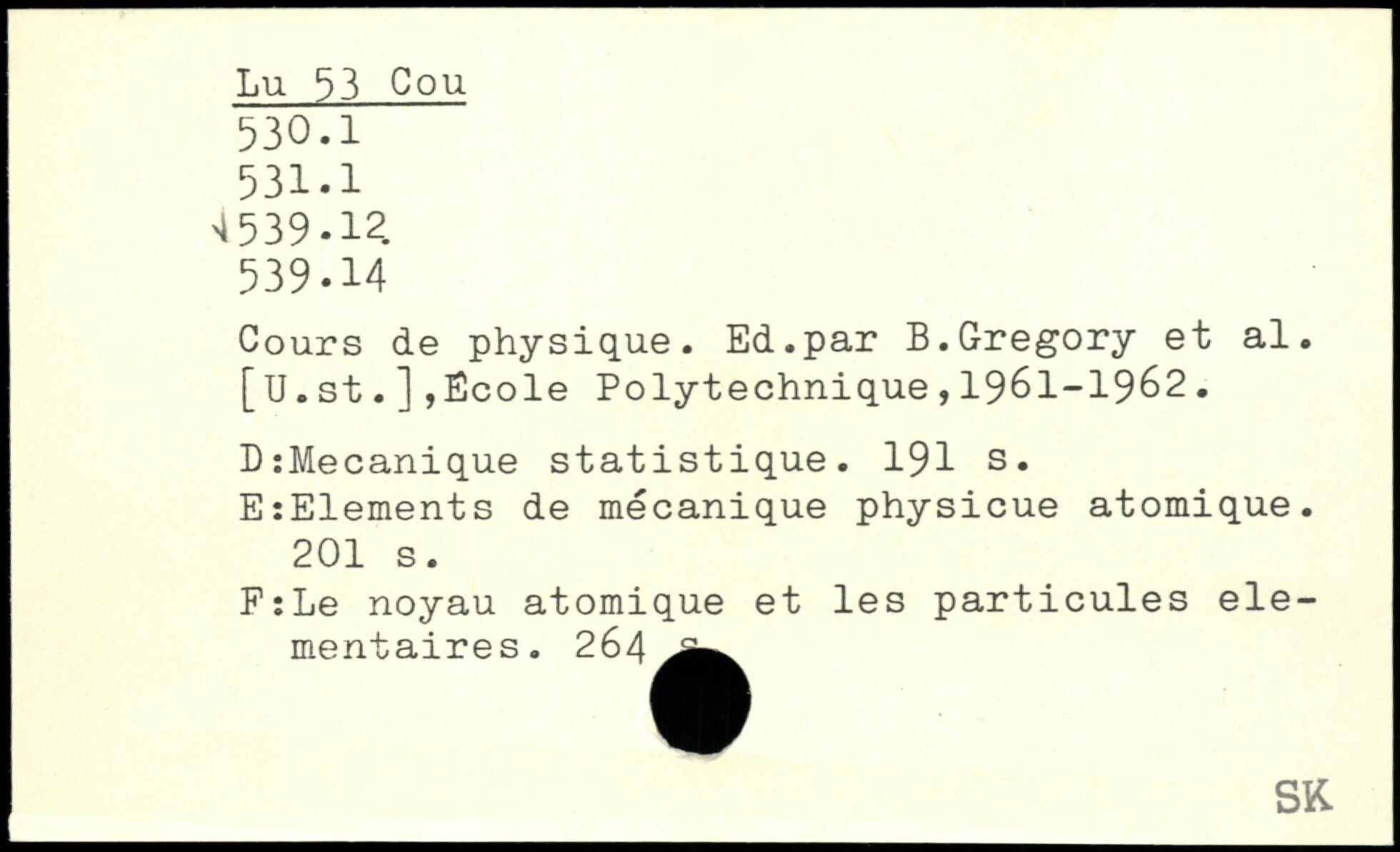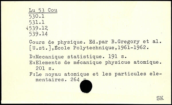 Cours de physique. Ed.par B.Gregory et al. [U.st.],Ecole Polytechnique,1961-1962. DtMecanique statistique.