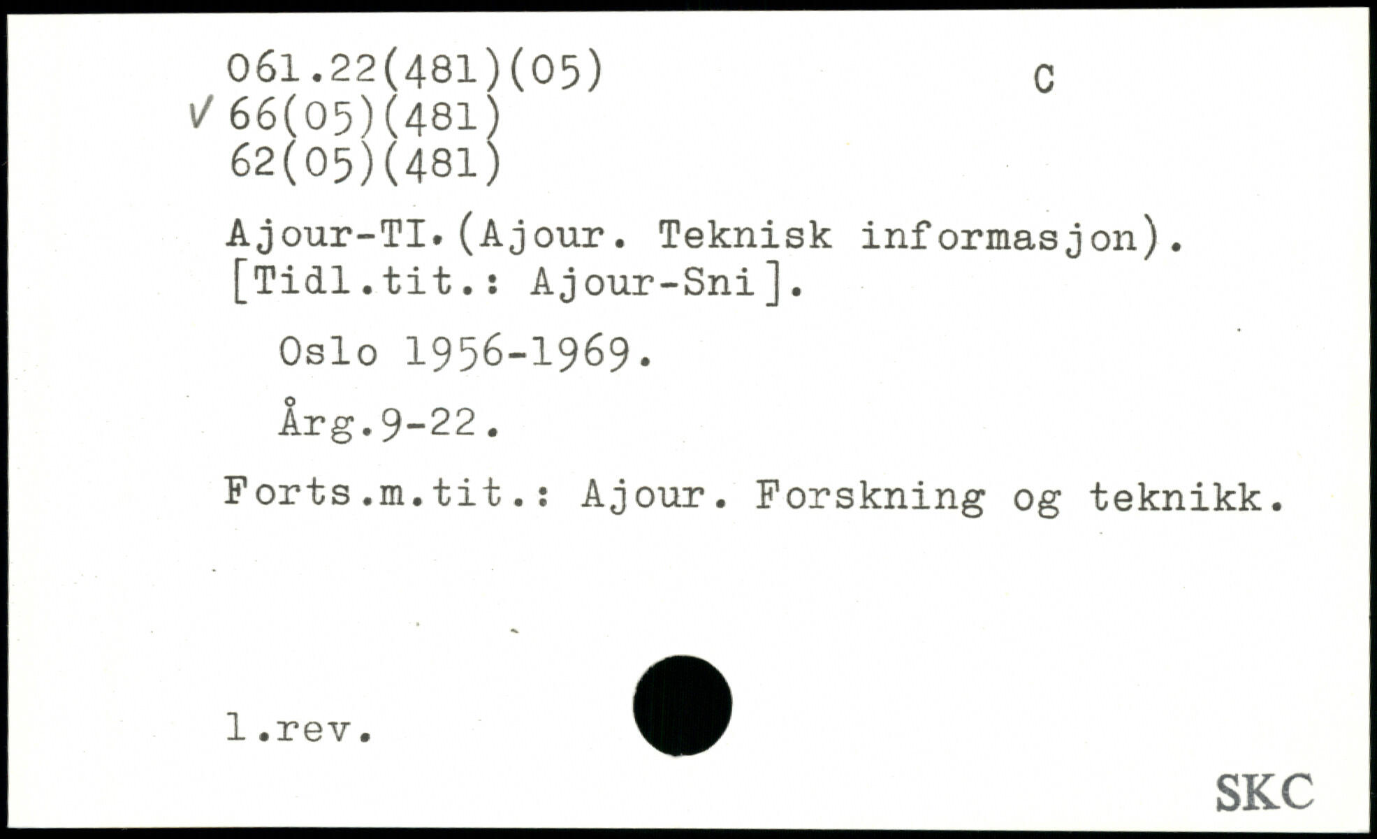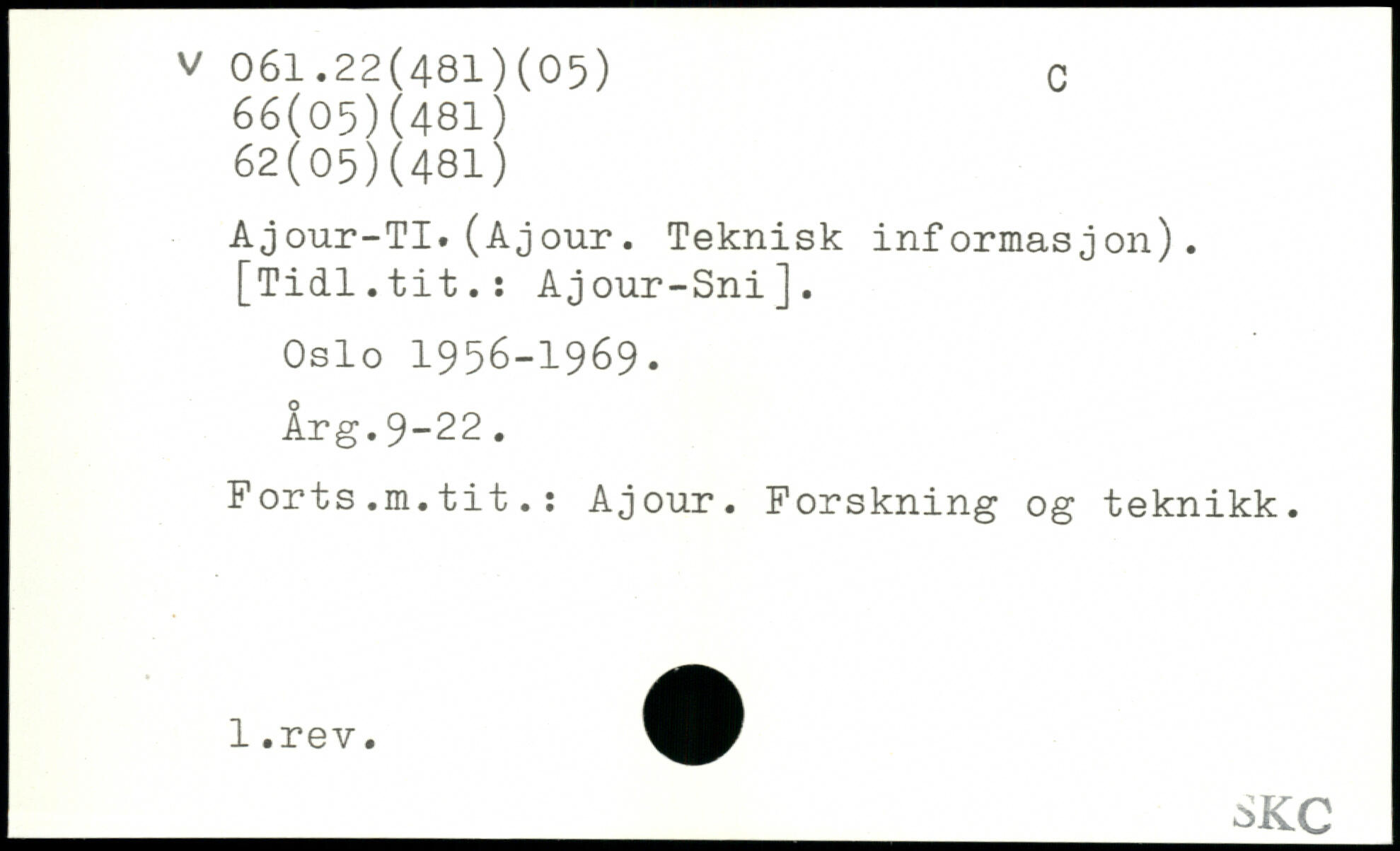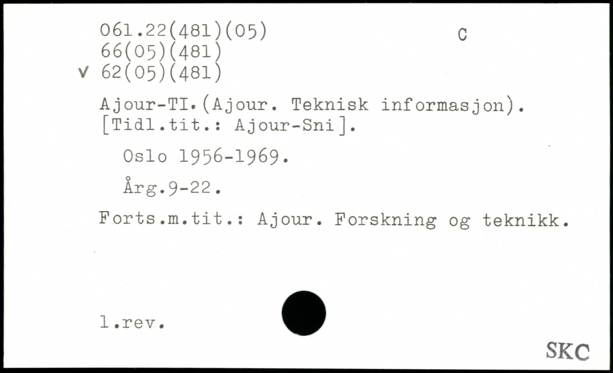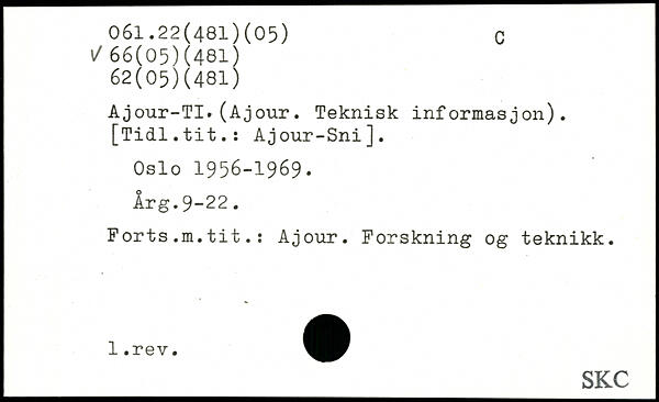 Ajour-TI. (Ajour. Teknisk informasjon). [Tidl.tit.: Ajour-Sni]. Oslo 1956-1969. Årg.9-22. Forts.m.tit.: Ajour. Forskning og teknikk.