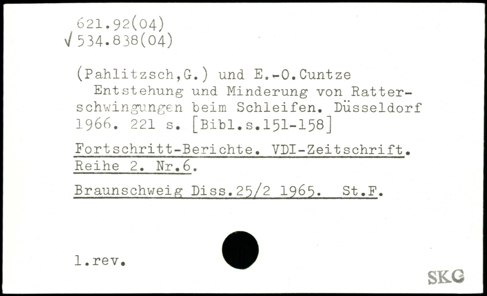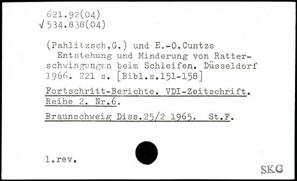 (Pahlitzsch,G.) und E.-O.Cuntze Entstehung und Minderung von Ratterschwingungen beim Schleifen. Düsseldorf 1966.