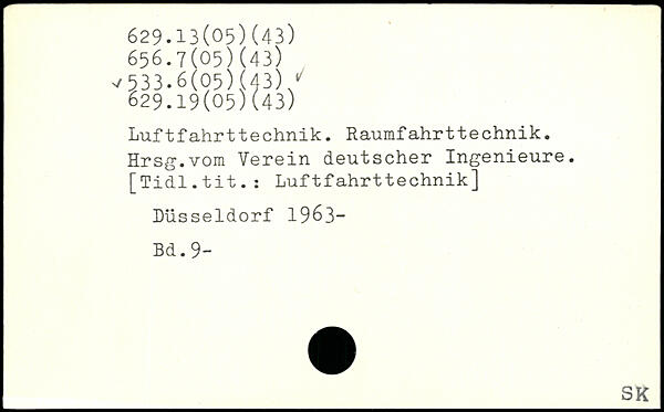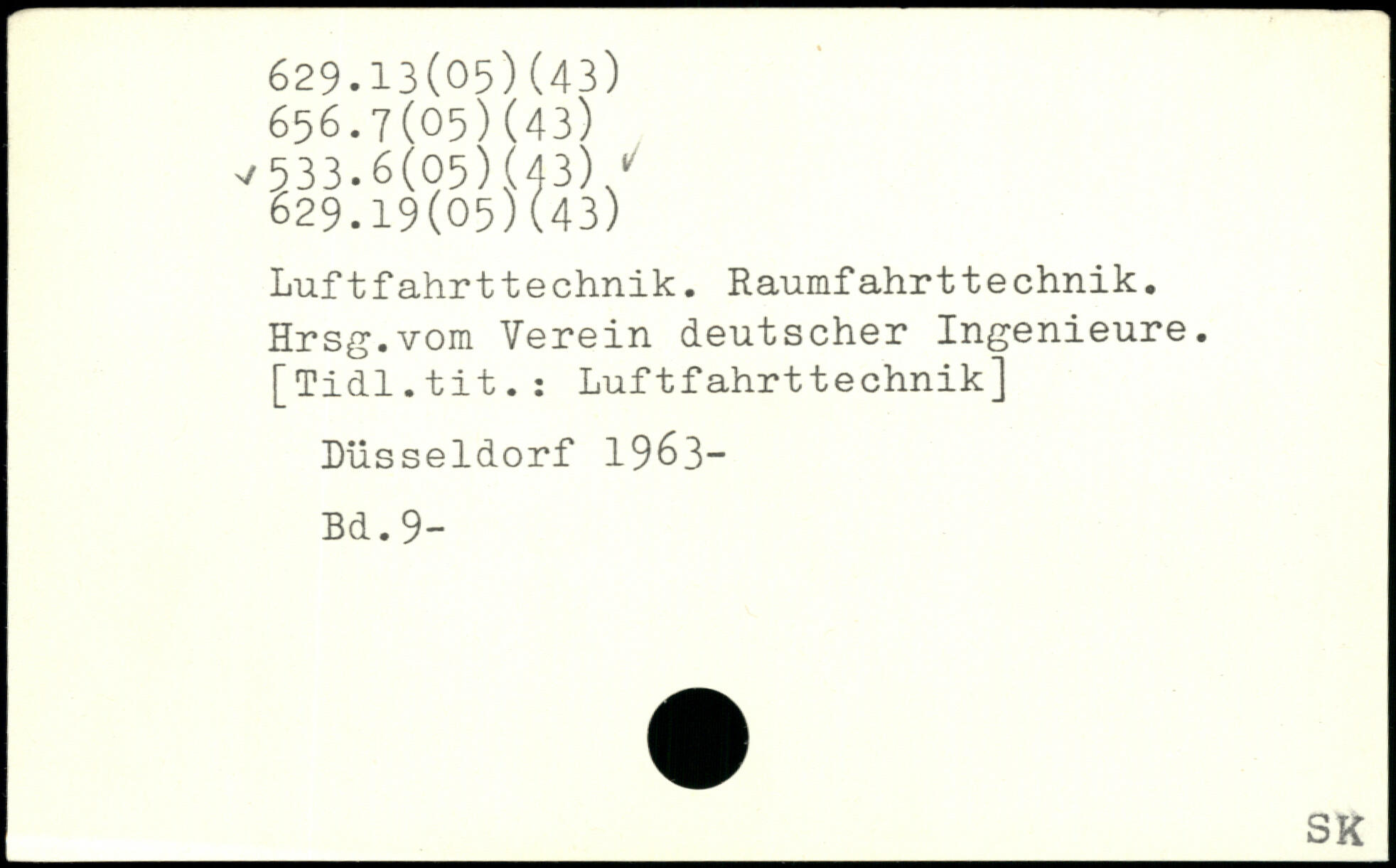 Luftfahrttechnik. Raumfahrttechnik. Hrsg.vom Verein deutscher Ingenieure. [Tidl.tit.: Luftfahrttechnik] Düsseldorf 1963- Bd. 9-