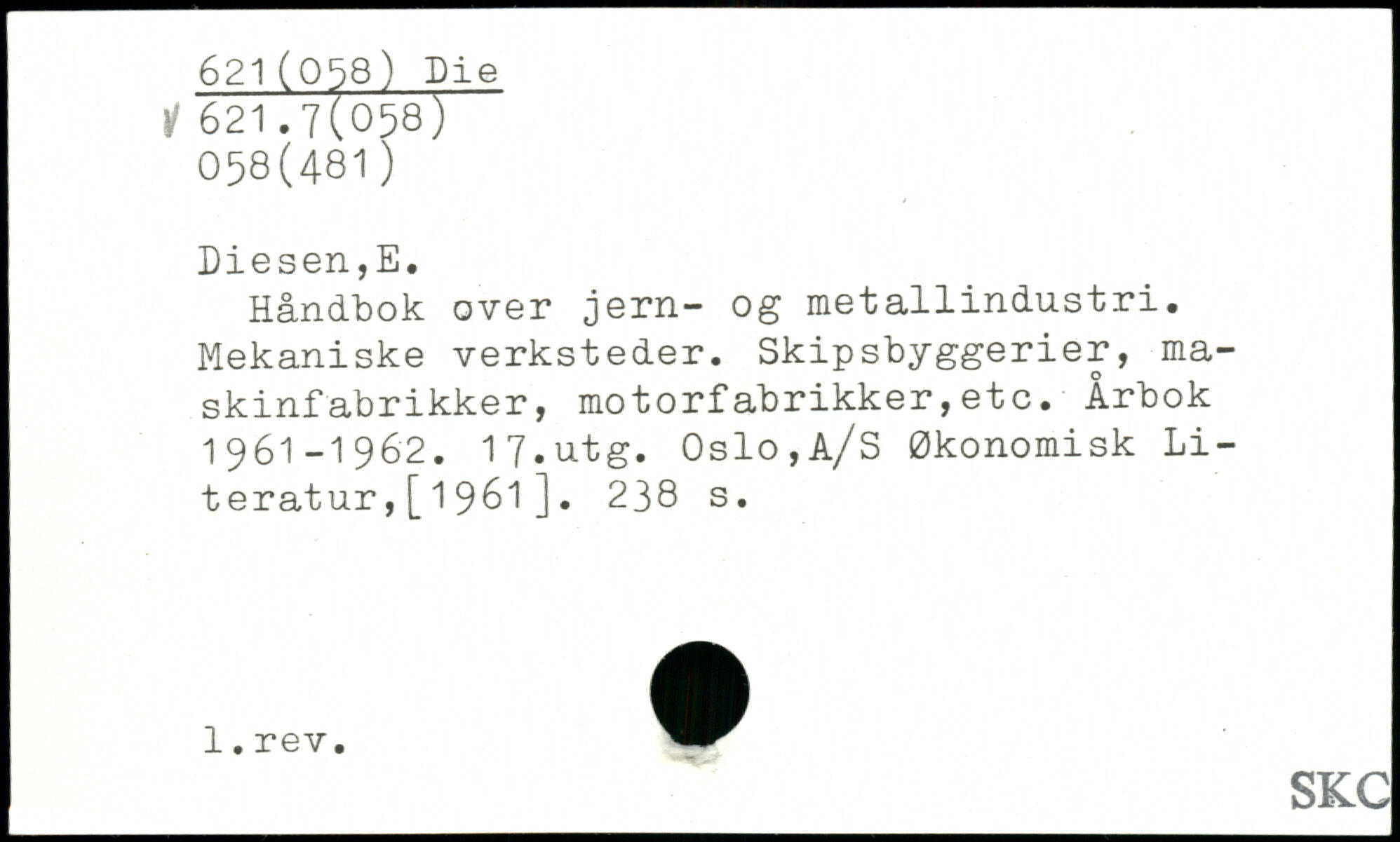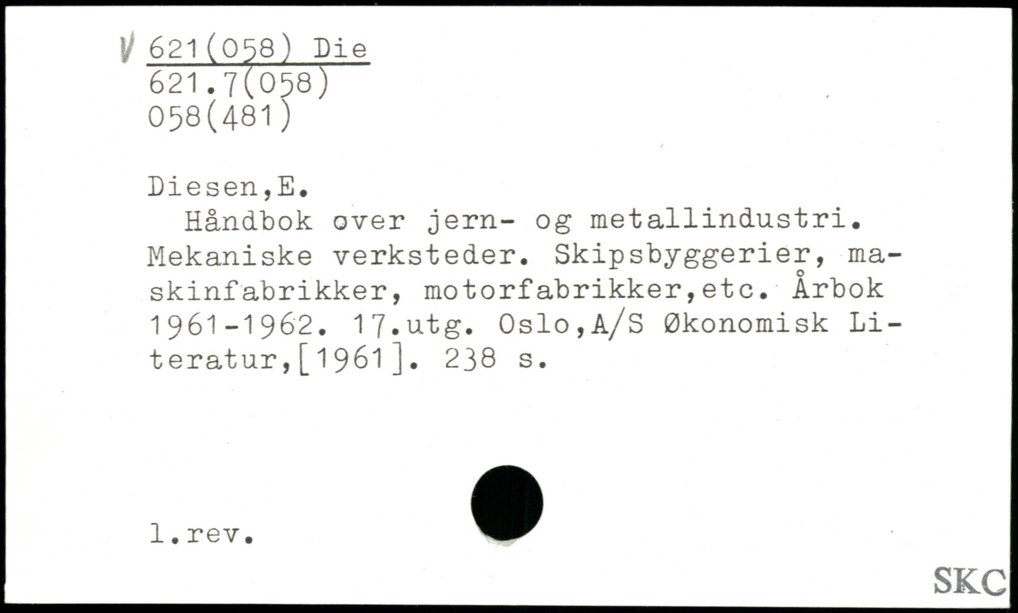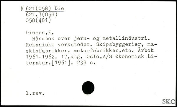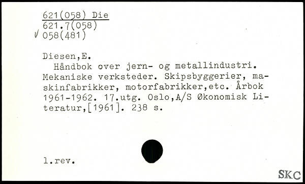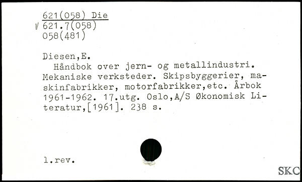 Håndbok over jern- og metallindustri. Mekaniske verksteder. Skipsbyggerier, maskinfabrikker, motorfabrikker,etc. Årbok 1961-1962. 17.utg. Oslo,A/S Økonomisk Literatur ,[1961].