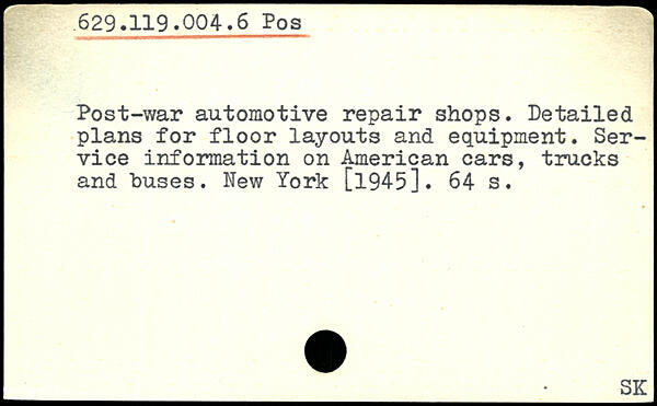 Post-war automotive repair shops. Detailed plans for floor layouts and equipment. Service information on American cars, trucks and buses.
