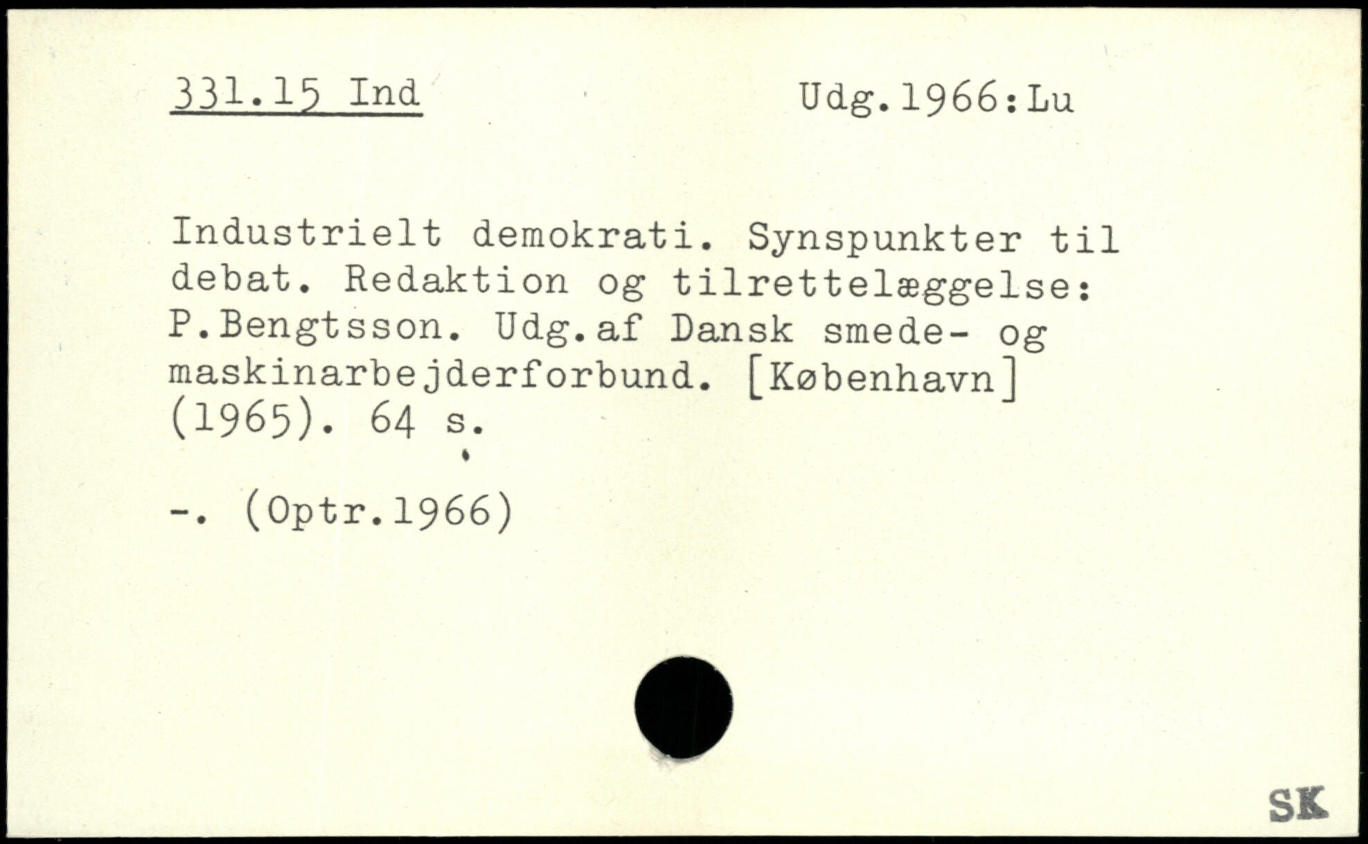 Industrielt demokrati. Synspunkter til debat. Redaktion og tilrettelæggelse: P.Bengtsson. Udg.af Dansk smede- og maskinarbejderforbund. [København] (1965).