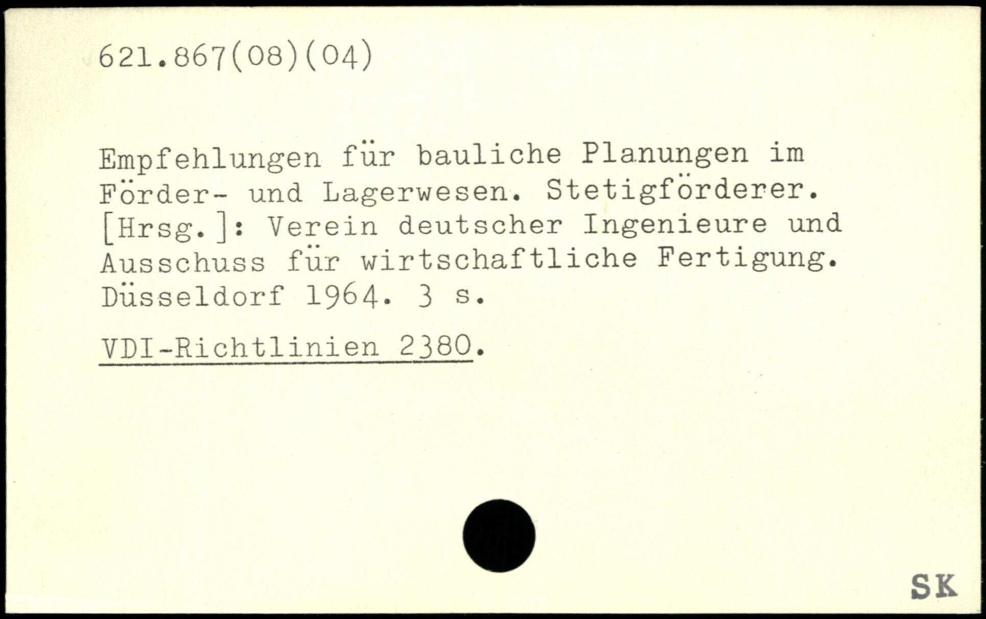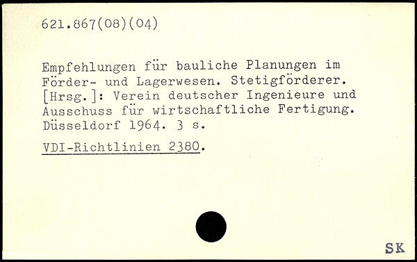 Empfehlungen für bauliche Planungen im Förder- und Lagerwesen. Stetigförderer. [Hrsg.]: Verein deutscher Ingenieure und Ausschuss für wirtschaftliche Fertigung. Düsseldorf 1964