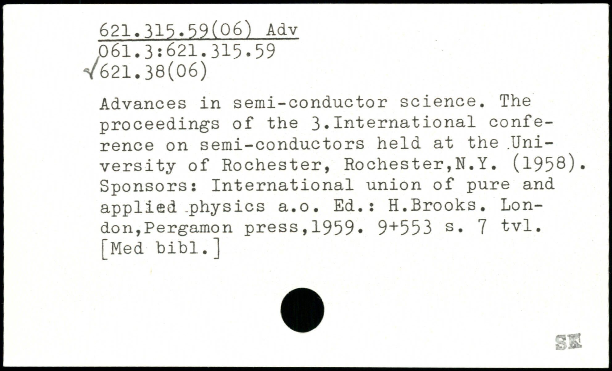 Advances in semi-conductor science. The proceedings of the 3.International conference on semi-conductors held at the .University of Rochester, Rochester,N.Y. (1958), Sponsors: International union of pure and applied .physics a.o. Ed.: H.Brooks.