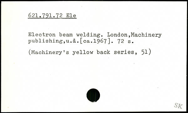 Electron beam welding. London,Machinery publishing,u.a.[ca.1967].