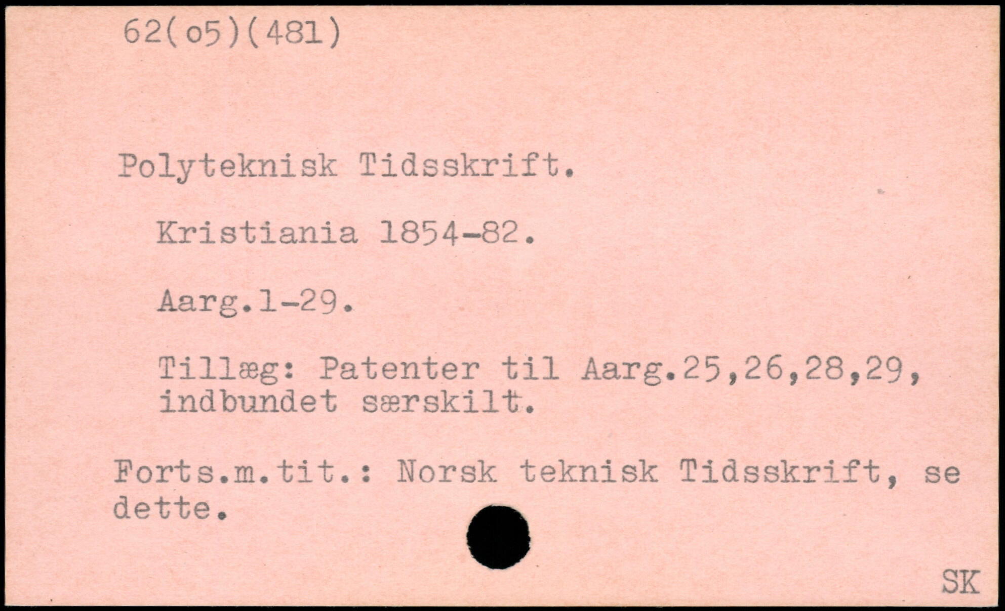 Polyteknisk Tidsskrift. Kristiania 1854-82. Aarg.1-29. Tillæg: Patenter til Aarg.25,26,28,29, indbundet særskilt. Ports.m.tit.: Norsk teknisk Tidsskrift, se dette.