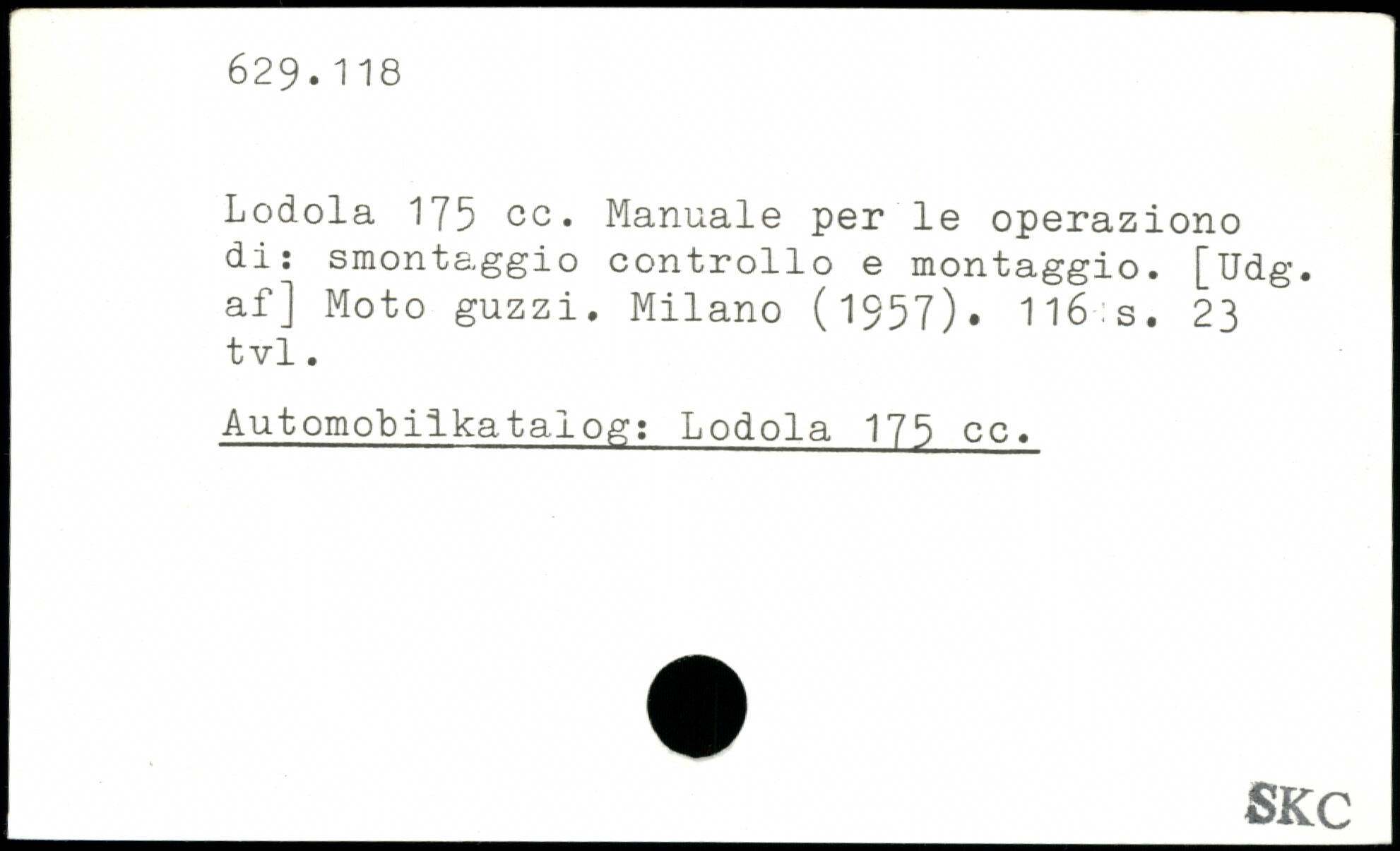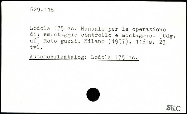 Lodola 175 cc. Manuale per le operaziono di: smontaggio controllo e montaggio. [Udg. af] Moto guzzi. Milano (1957).