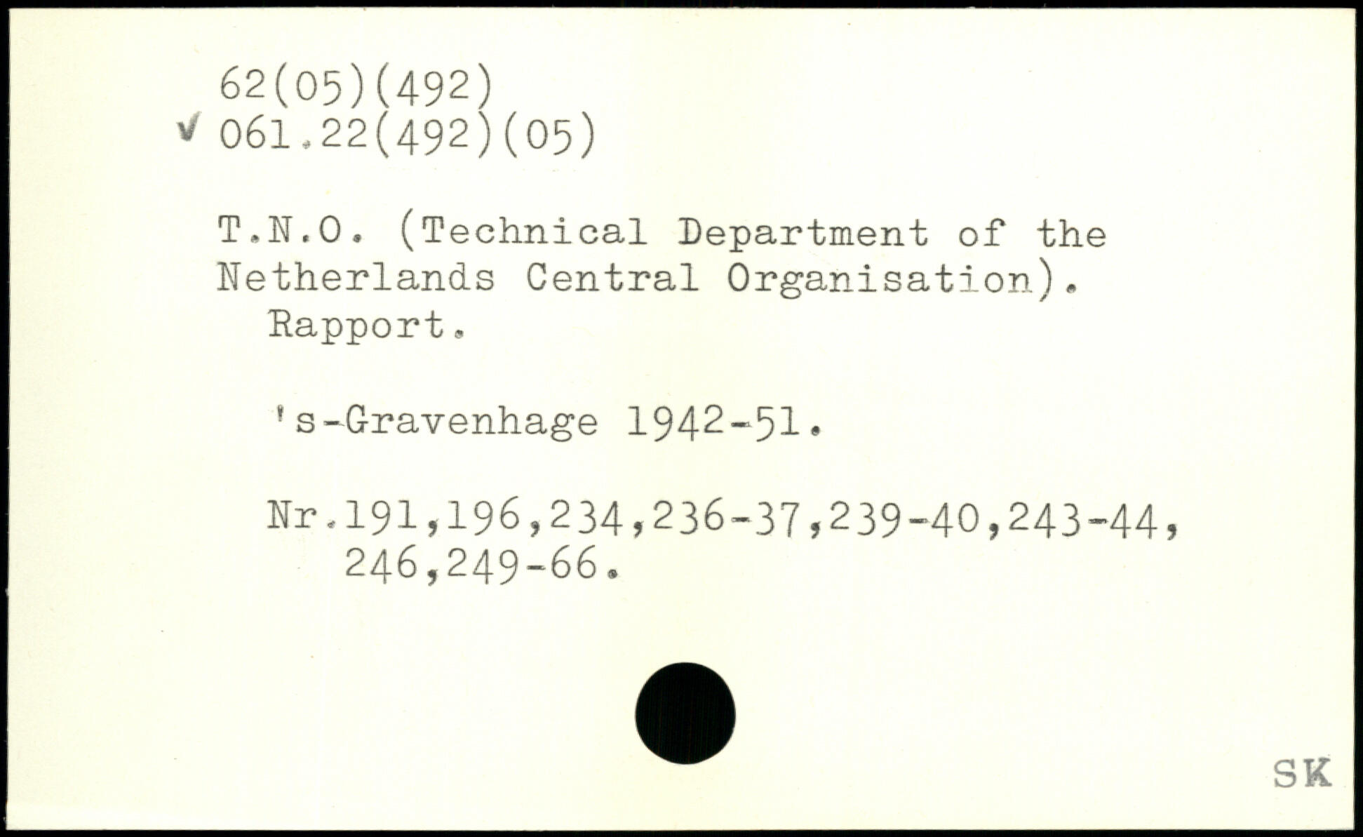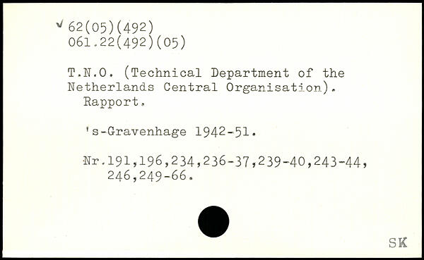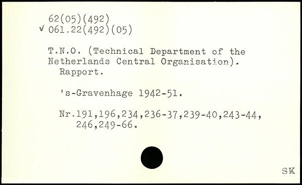 T.N.O. (Technical Department of the Netherlands Central Organisation). Eapport. 's-Gravenhage 1942-51, Nr.191,196,234,236-37,239-40,243-44, 246,249-66.