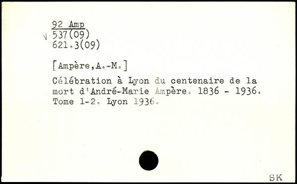 f Ampère,A.-M.] Célébration à Lyon du centenaire de la mort d'André-Marie Ampère, 1836 - 1936, Tome 1-2, Lyon 1936.