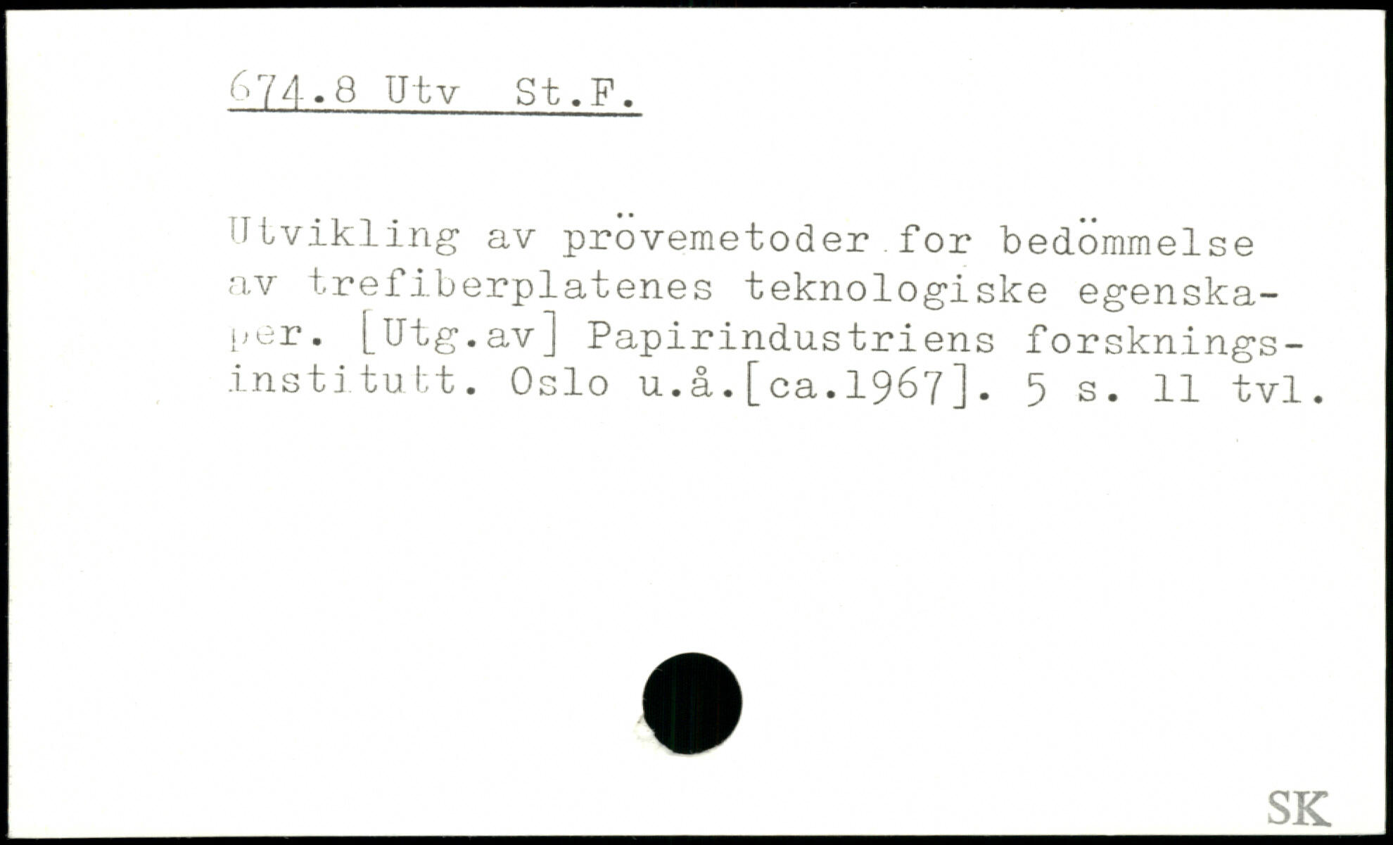 TJtvikling av prøvemetoder for bedømmelse a.v trefiberplatenes teknologiske egenskaper. [U^g-av] Papirindustriens forsknings-institutt. Oslo u.å.[ca.1967].