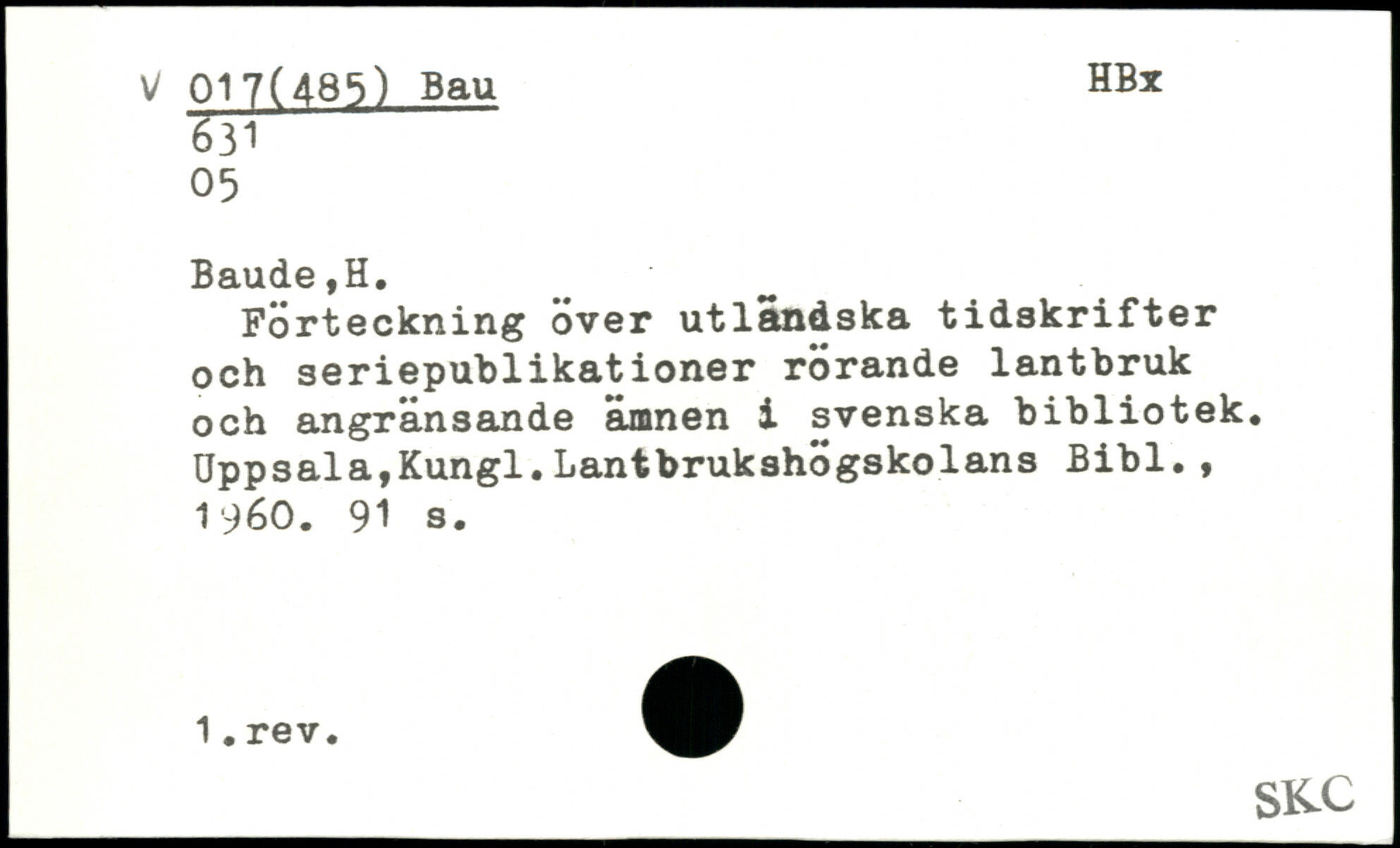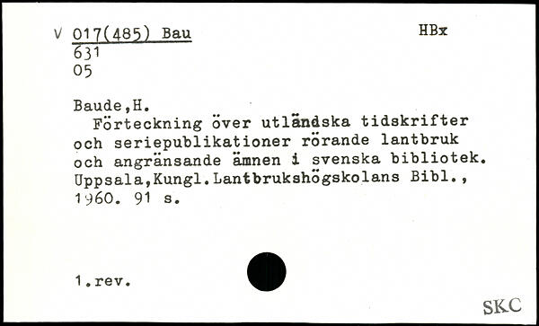 Förteckning över utländska tidskrifter och seriepublikationer rörande lantbruk och angränsande ämnen i svenska bibliotek. Uppsala,Kungl.Lantbrukshögskolans Bibi., 19é0.