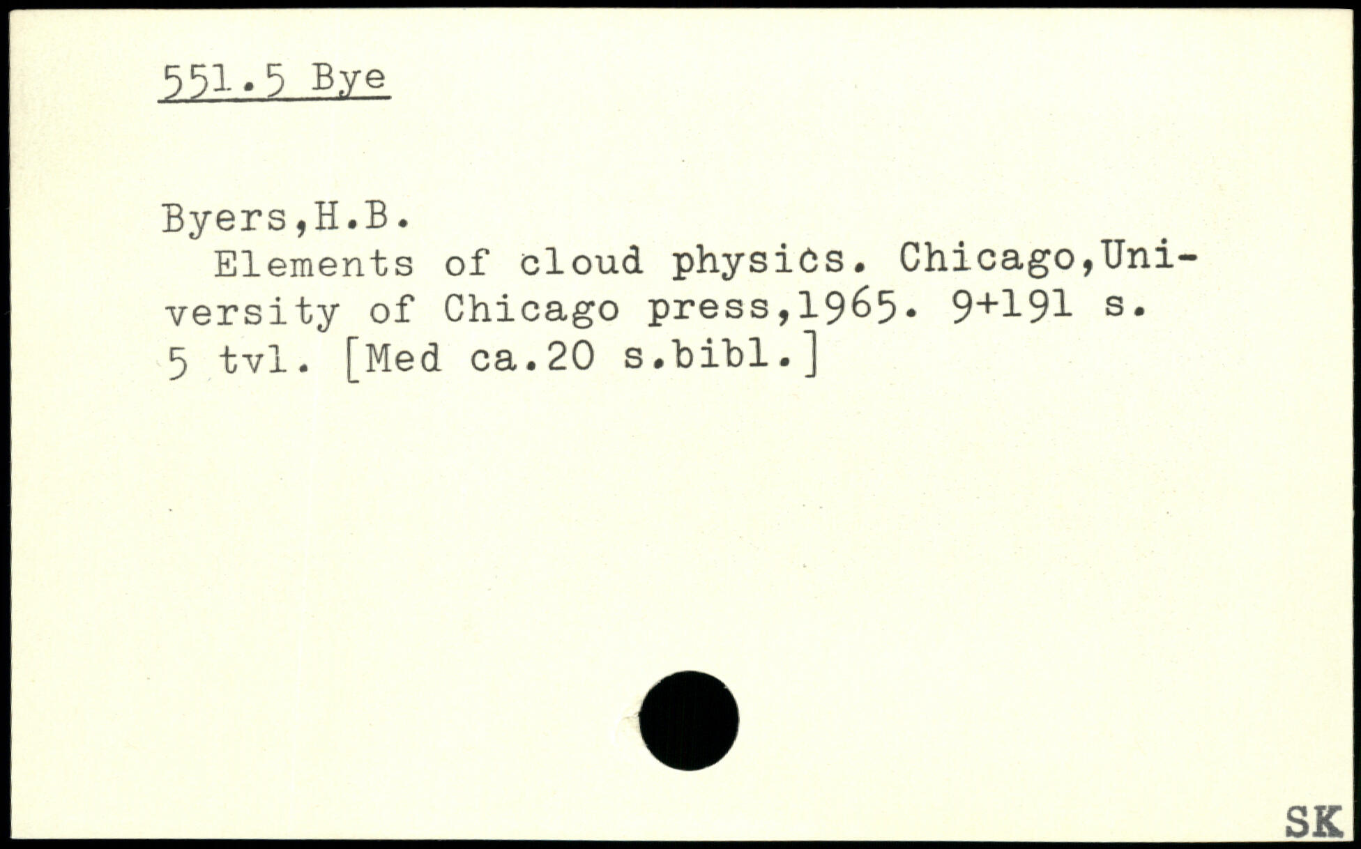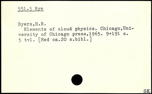 Elements of cloud physics, Chicago,TJni-versity of Chicago press,1965. 9+191 s. 5 tvl, [Med ca.20 s.bihl.]