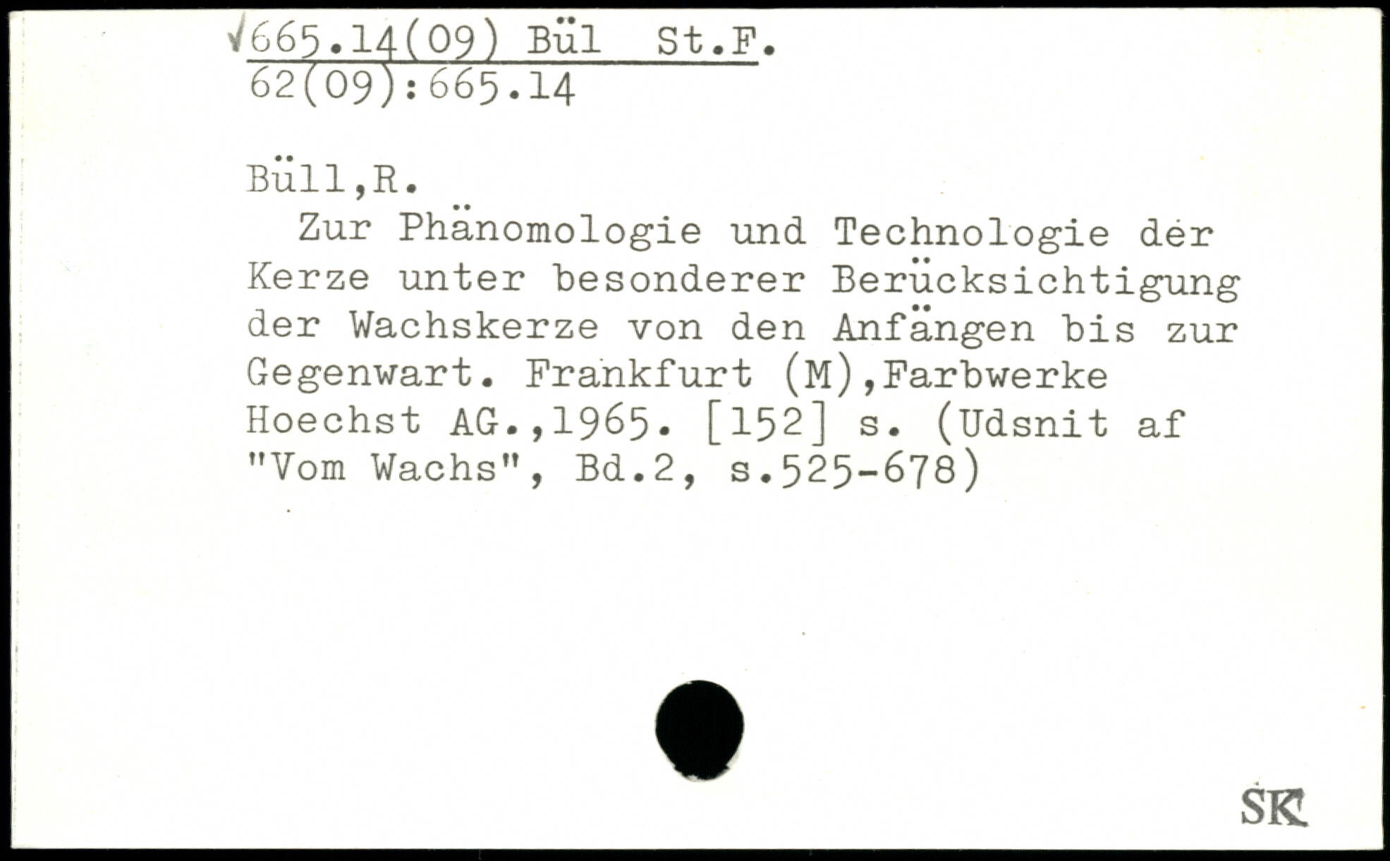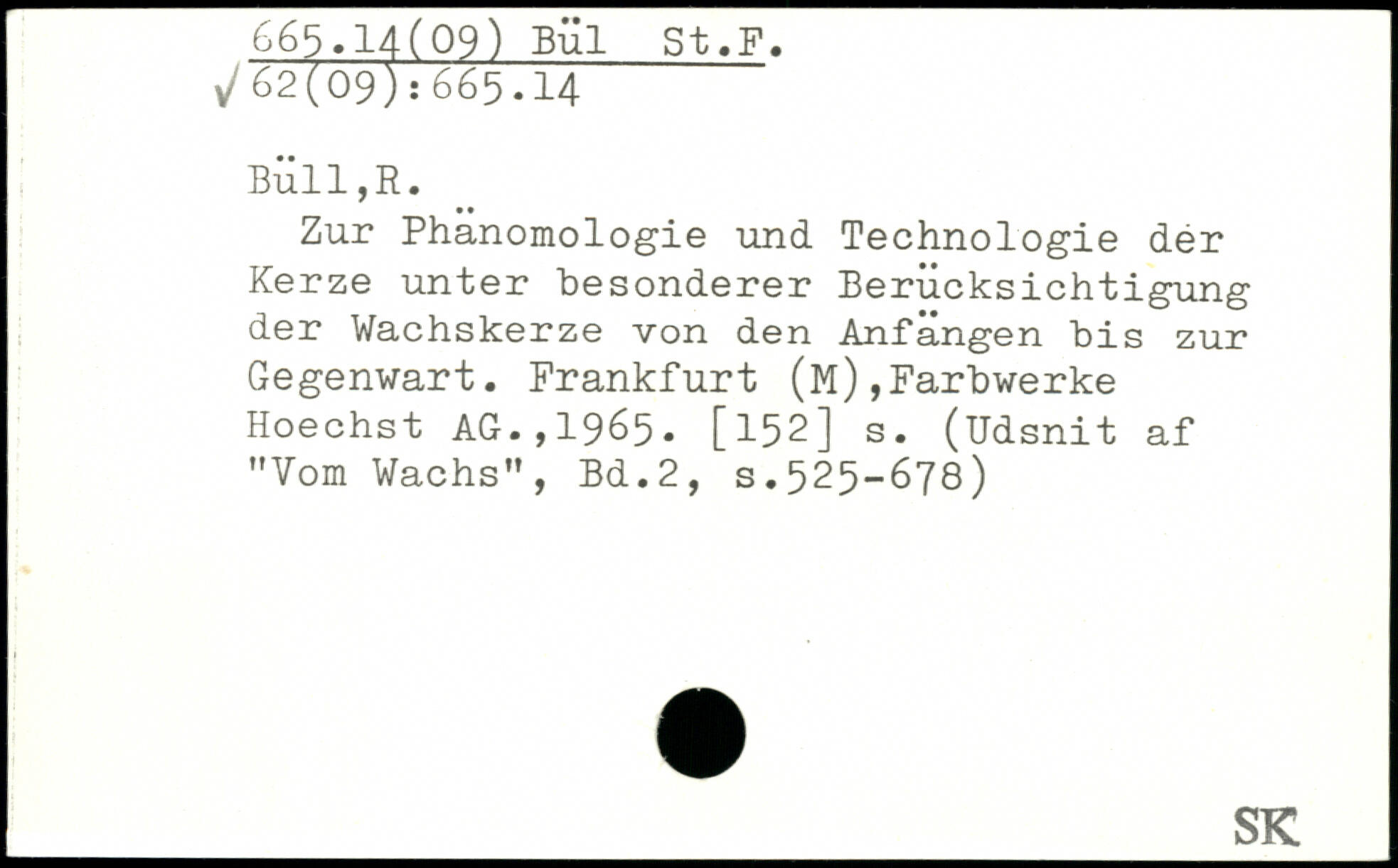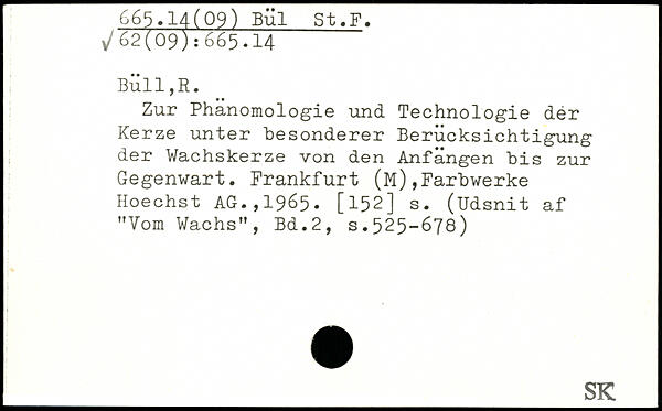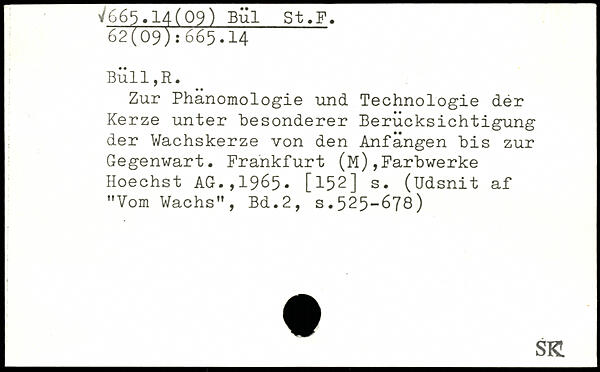 Zur Phanomologie und Technologie dér Kerze unter besonderer Berücksichtigung der Wachskerze von den Anfängen bis zur Gegenwart. Frankfurt (M),Farbwerke Hoechst AG.,1965. [152] s. (Udsnit af "Vom Wachs"