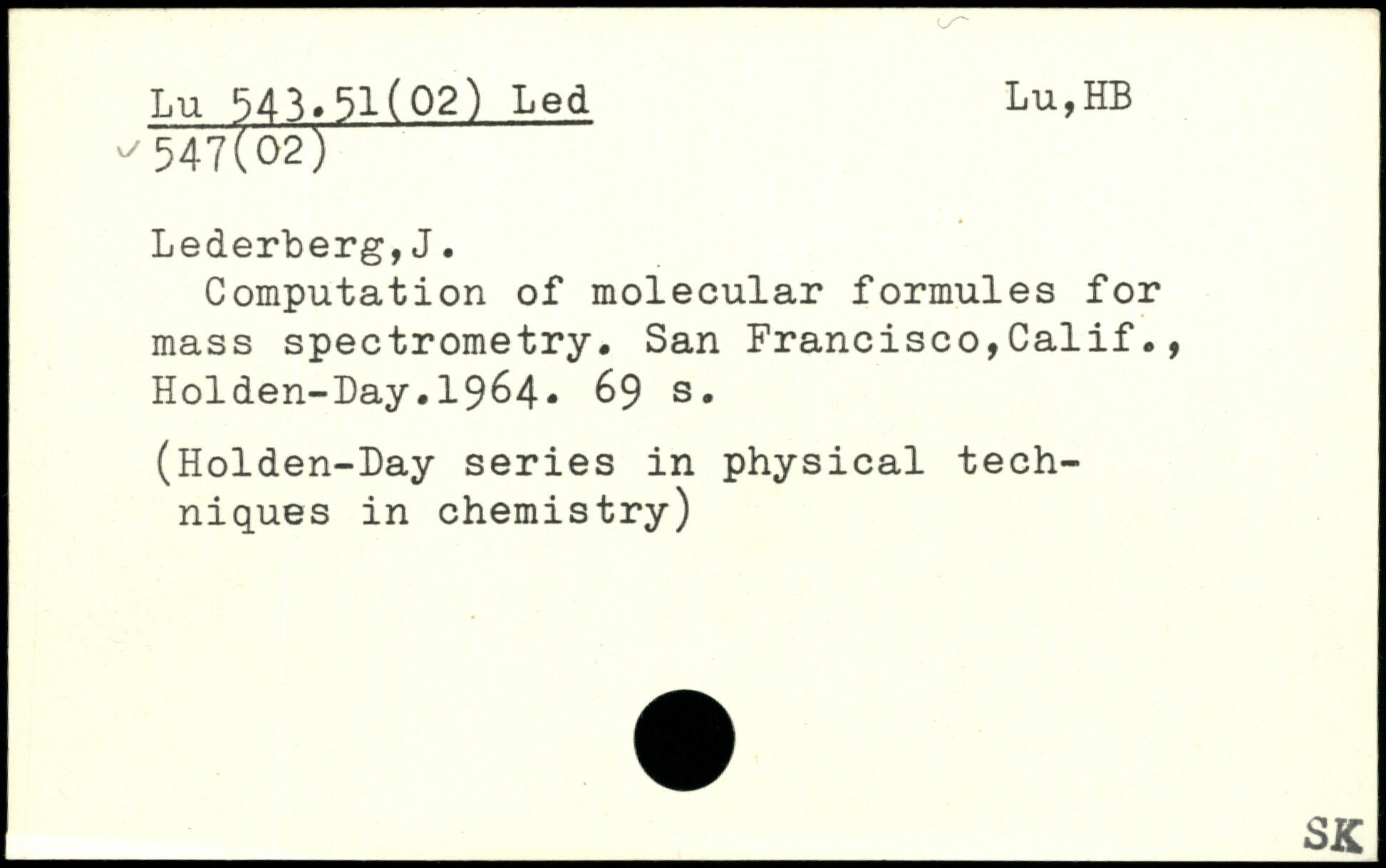 Computation of molecular formules for mass spectrometry. San Francisco,Calif., Holden-Day.1964.