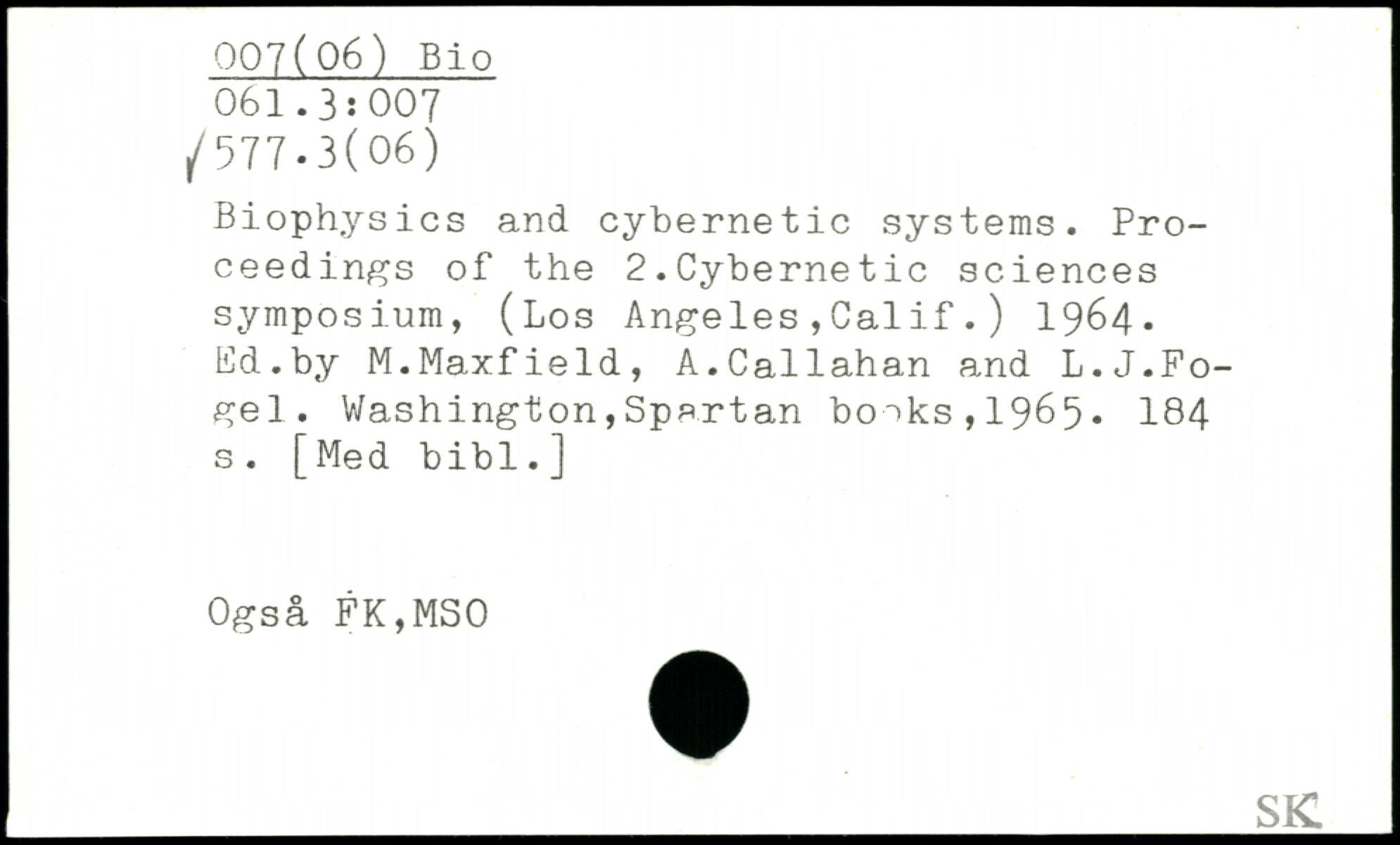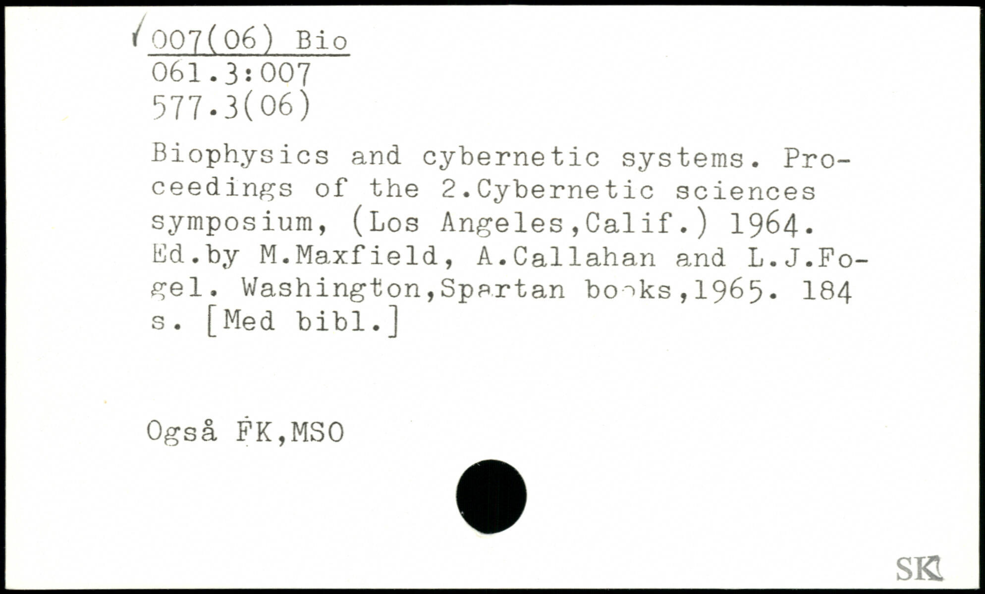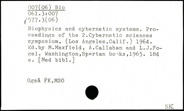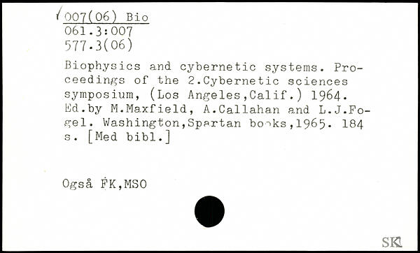 Biophysics and cybernetic systems. Proceedings of the 2.Cybernetic sciences symposium, (Los Angeles,Cal if.) 1964. Ed.by M.Maxfield, A.Callahan and L.J.Fo-gel.