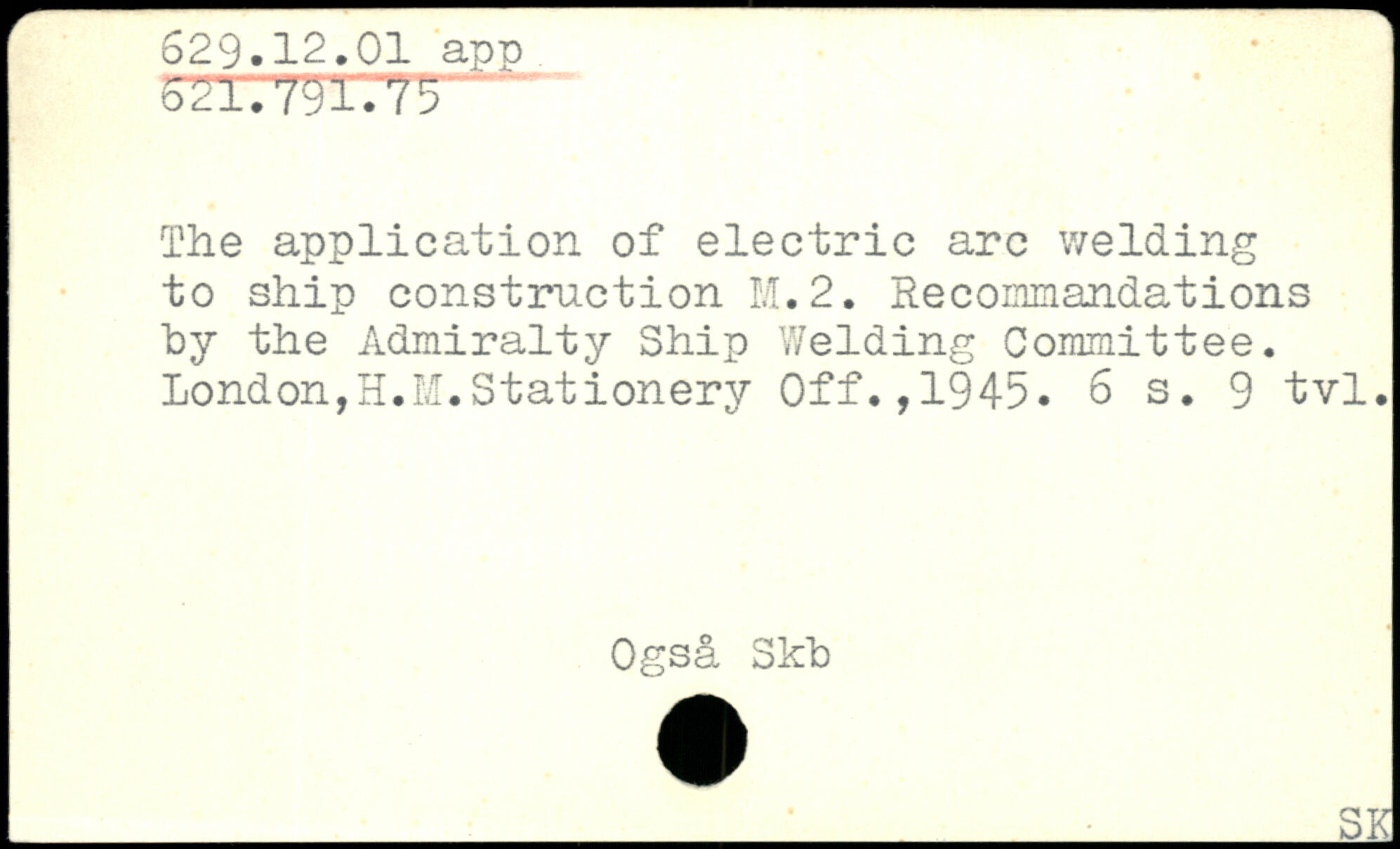 The application of electric arc welding to ship construction M.2. Recommandations by the Admiralty Ship Welding Committee. London,H.M.Stationery Off.,1945.