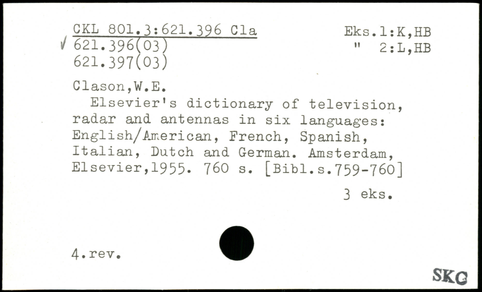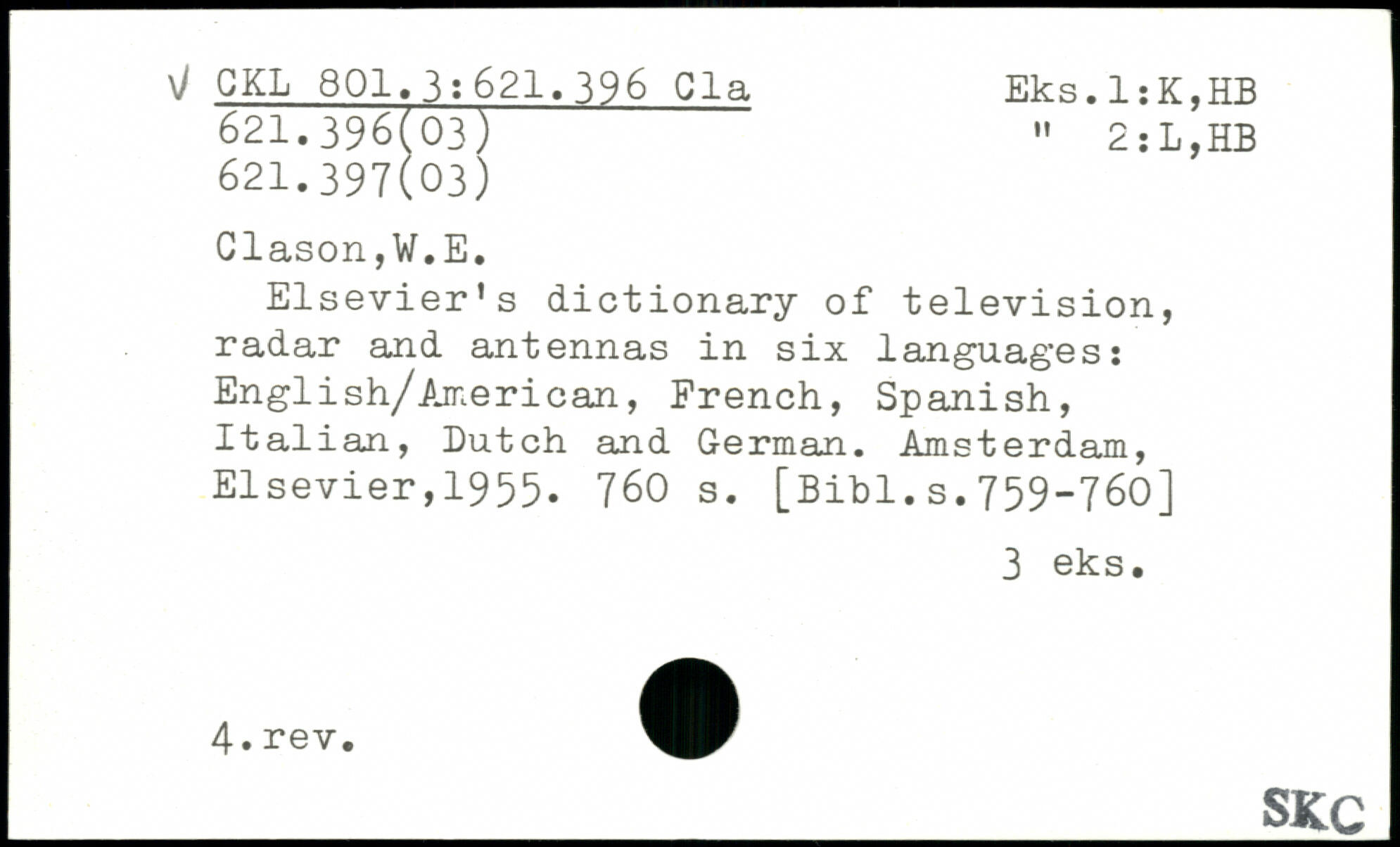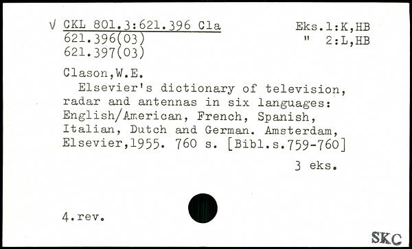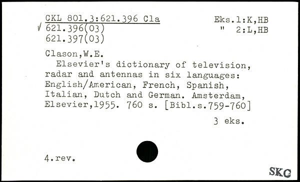 Elsevier's dictionary of television, radar and antennas in six languages: English/American, French, Spanish, Italian, Dutch and German.