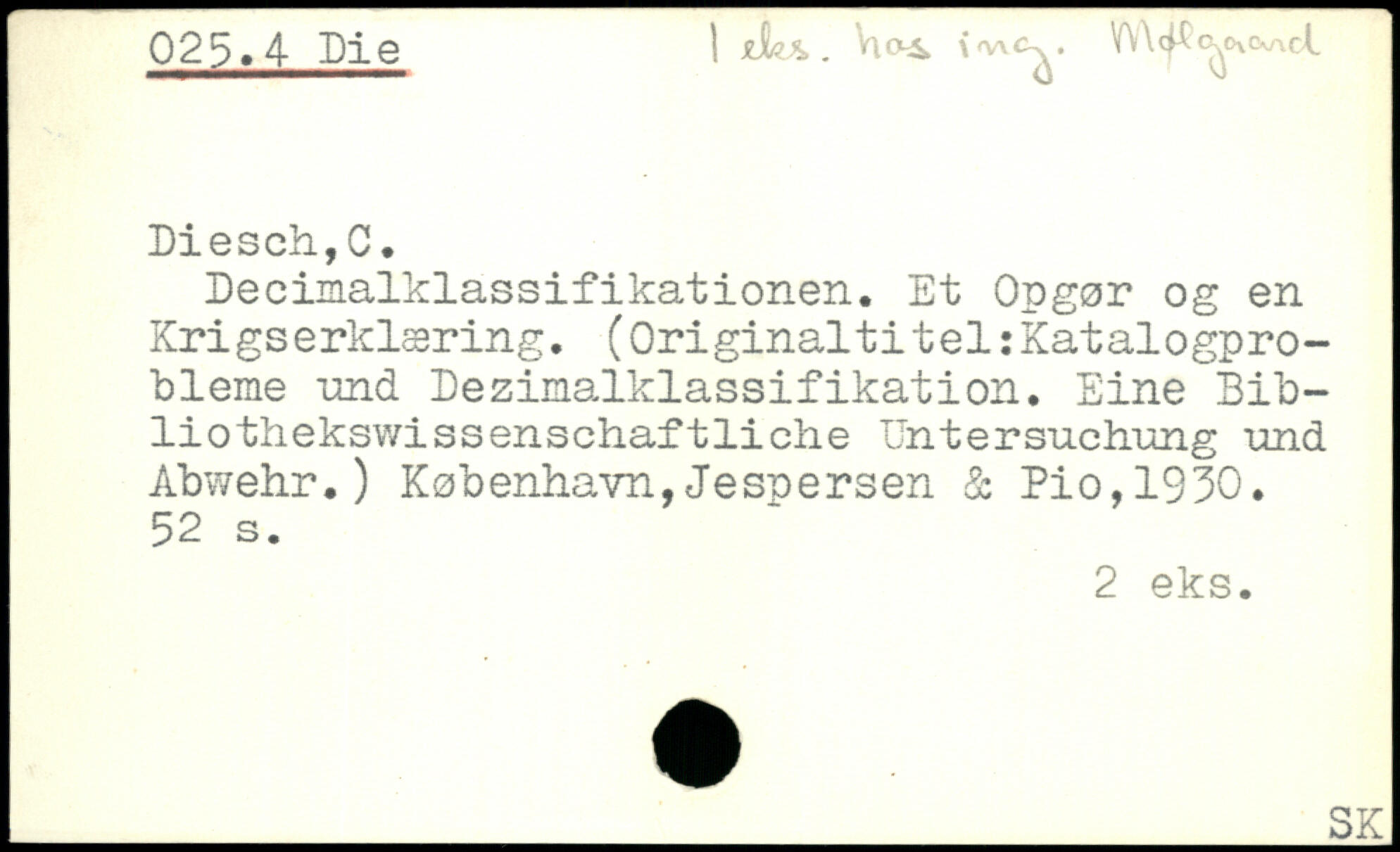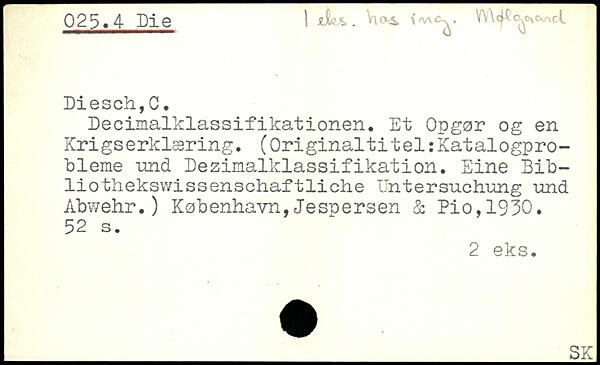 Decimalklassifikationen. Et Opgør og en Krigserklæring. (Originaltitelrkatalogpro-blerne und Dezimalklassifikation. Eine Bibliothekswissenschaftliche Untersuchung und Abwehr.)