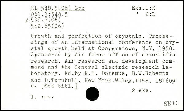 Growth and perfection of crystals. Proceedings of an International conference on crystal growth held at Cooperstown, N.Y. 1958, Sponsored by Air force office of scientific research, Air research and development command and the General electric research laboratory. Ed.by R.H. Doremus, B.W.Roberts and 1).Turnbull.