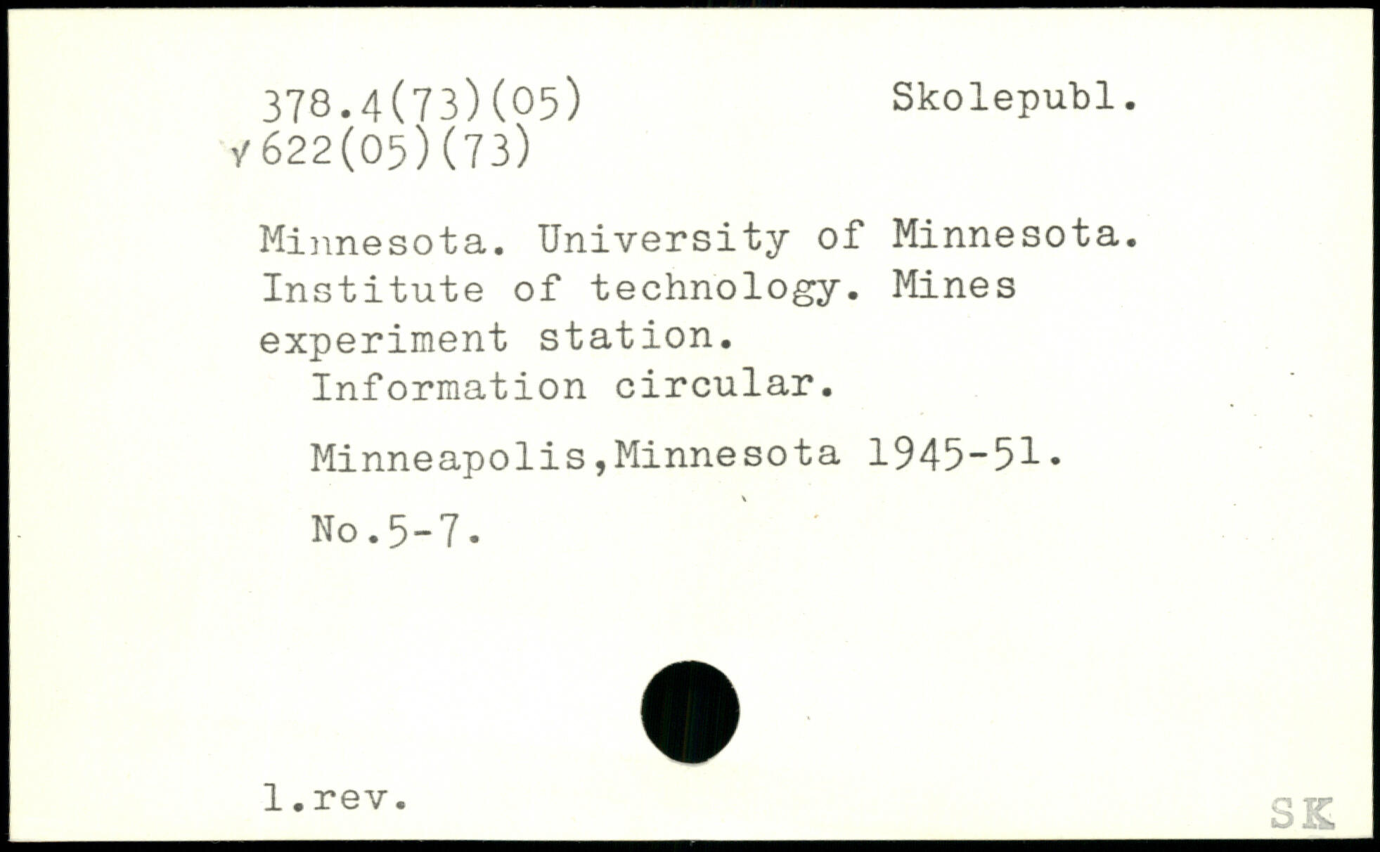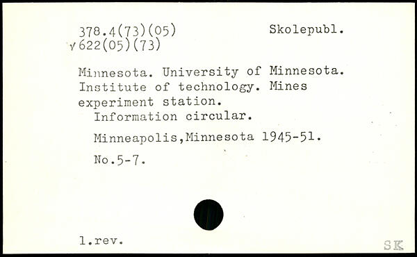 Minnesota. University of Minnesota. Institute of technology. Mines experiment station. Information circular. Minneapolis,Minnesota 1945-51. No.5-7. _1-rev- SK