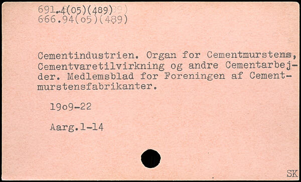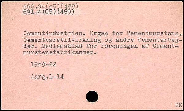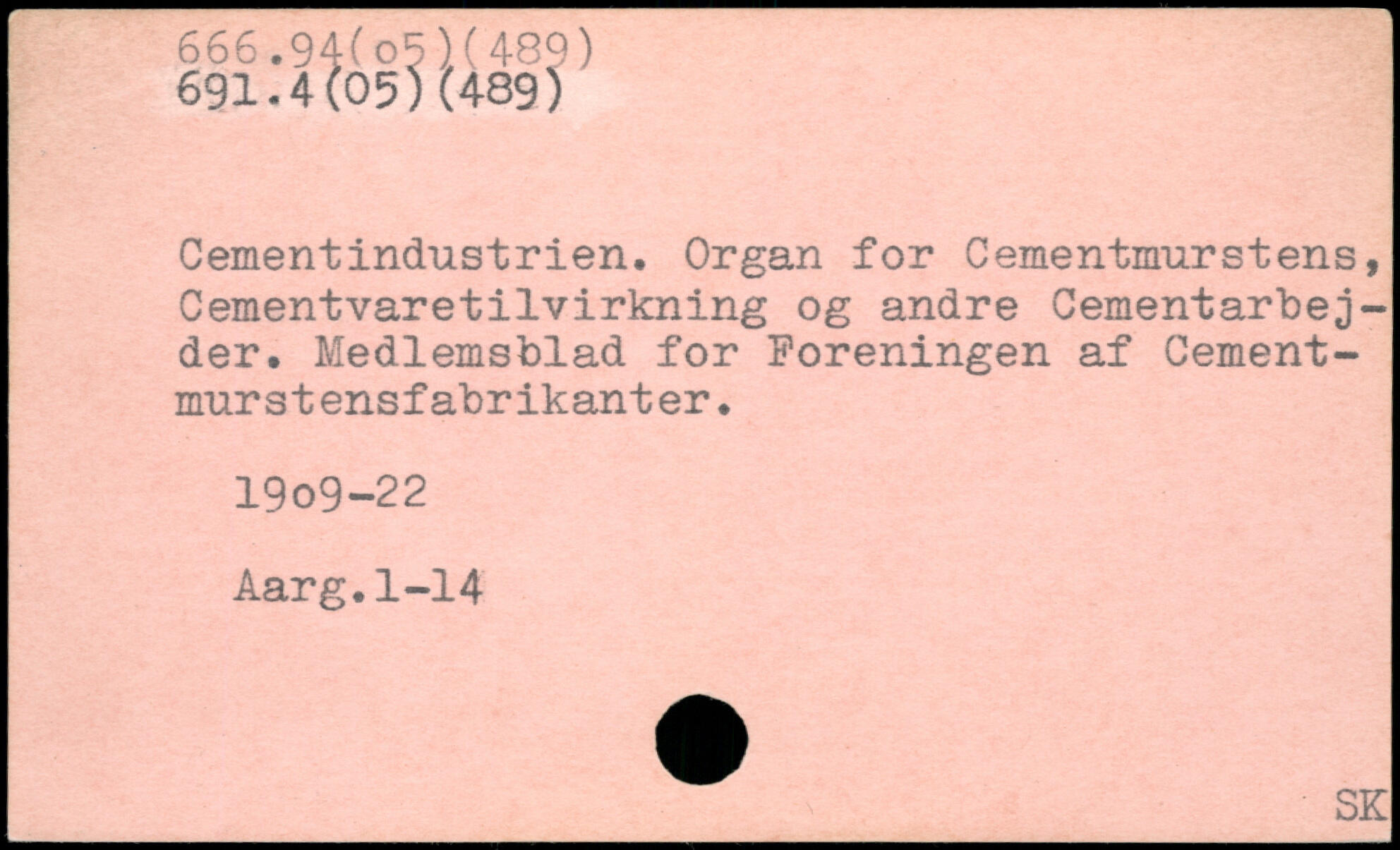 Cementindustrien. Organ for Cementmurstens, Cementvaretilvirkning og andre Cementar'bej-der. Medlemsblad for Foreningen af Cementmurstensfabrikanter. 19o9-22 Aarg.1-14