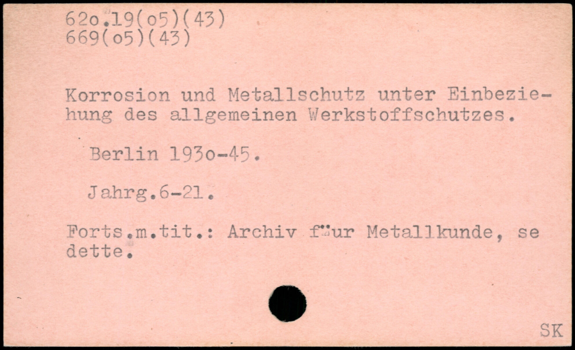 Korrosion und Metallschutz unter Einbeziehung des allgemeinen Werkstoffschutzes. Berlin 193o-45. Jahrg.6-21. Forts.m.tit.: Archiv f..ur Metallkunde, se dette.