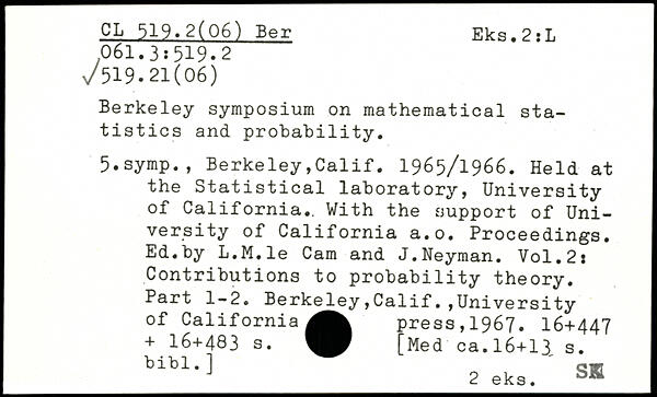 Berkeley symposium on mathematical statistics and probability. 5.symp., Berkeley,Calif. 1965/1966. Held at the Statistical laboratory, University of California.. With the support of University of California a.o. Proceedings. Ed.by L.M.le Cam and J.Neyman.