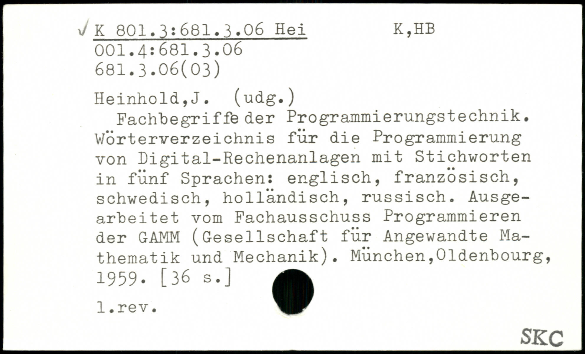 Fachbegriffe der Programmierungstechnik. Wörterverzeichnis für die Programmierung von Digital-Rechenanlagen mit Stichworten in fünf Sprachen: englisch, französisch, schwedisch, holländisch, russisch. Ausgearbeitet vom Fachausschuss Programmieren der GAMM (Gesellschaft für Angewandte Mathematik und Mechanik).
