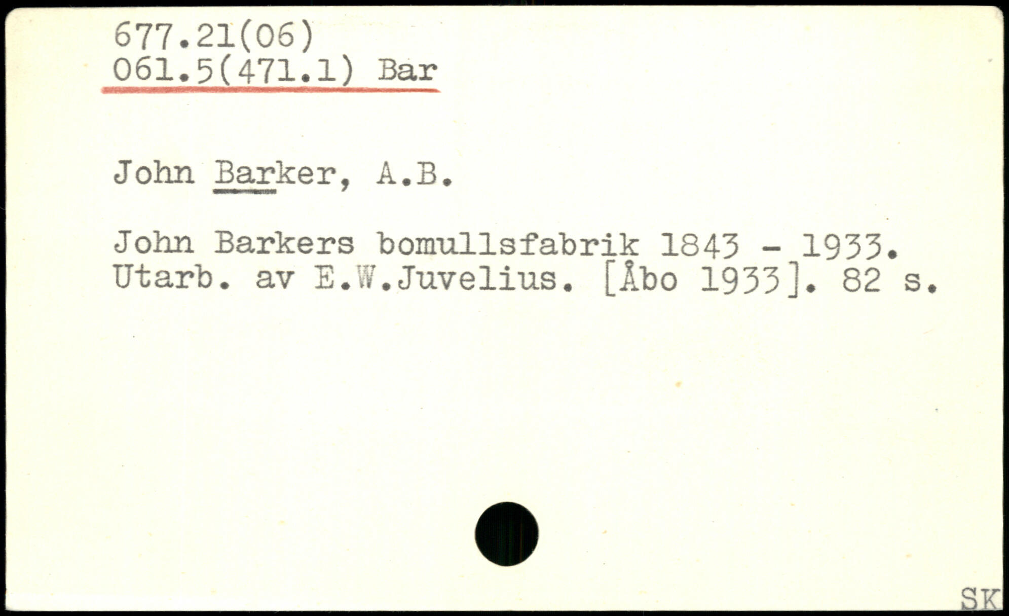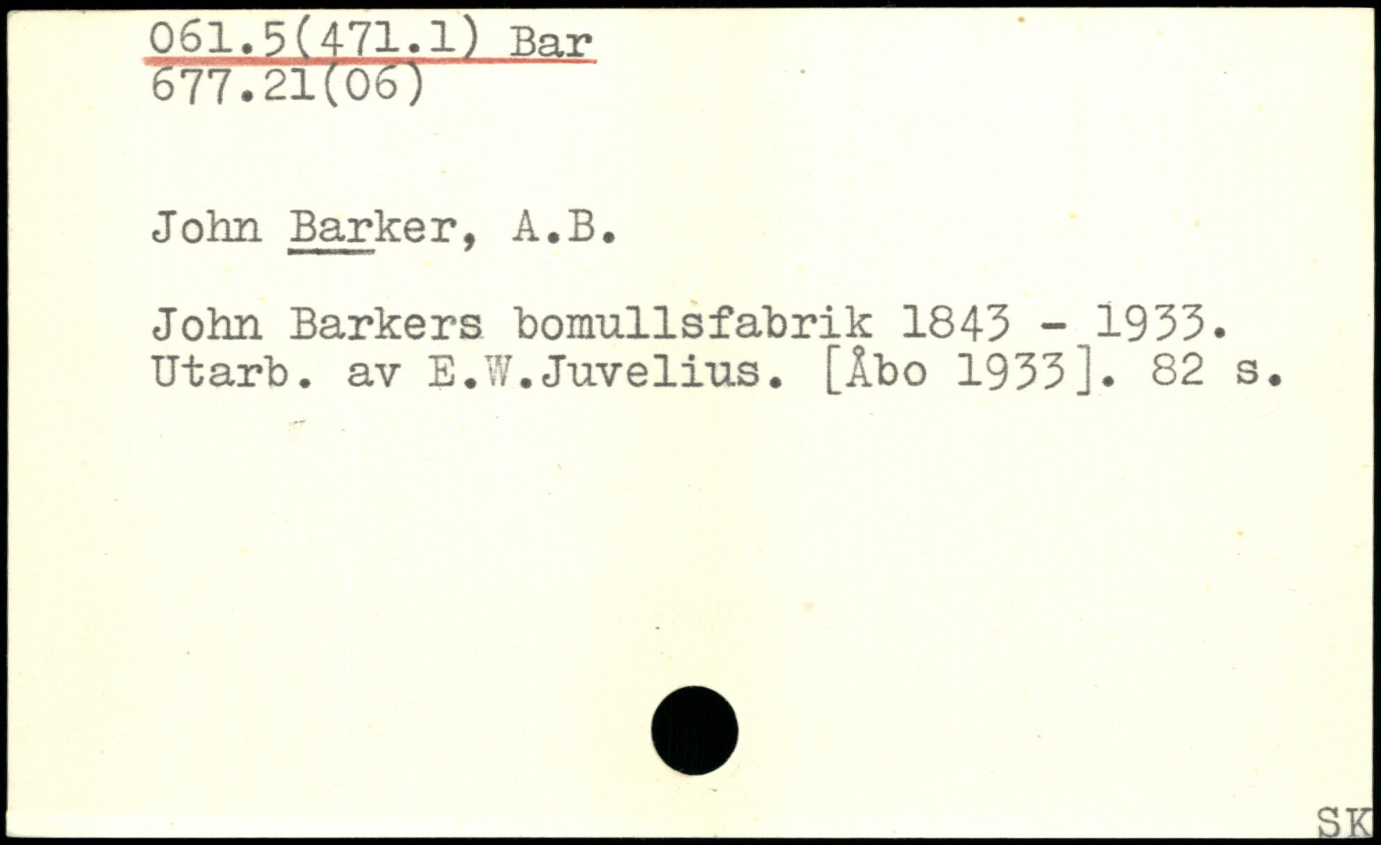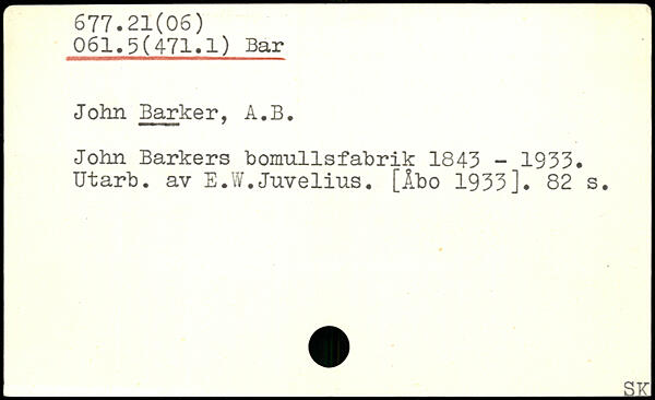 John Barkers Bomullsfabrik 1843 - 1933. Utarb. av E.W.Juvelius. [Åbo 1933].