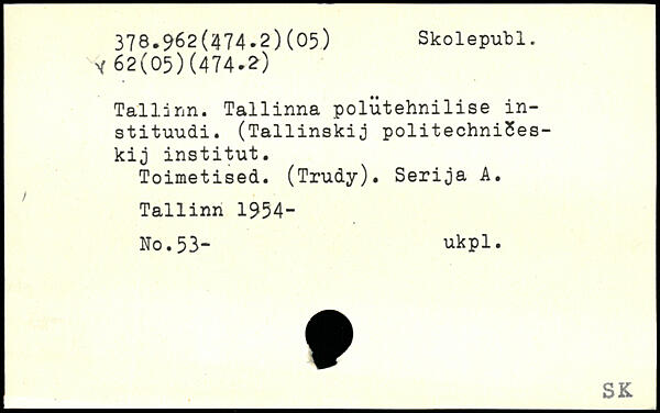 Tallinn. Tallinna polütehnilise in-stituudi. (Tallinskij politechniSes-kij institut. Toimetised. (Trudy). Serija A. Tallinn 1954- No.53- ukpl.