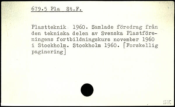 Plastteknik 1960. Samlade föredrag från den tekniska delen av Svenska Plastföreningens fortbildningskurs november 1960 i Stockholm.