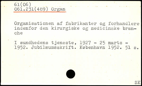 Organisationen af fabrikanter og forhandlere indenfor den kirurgiske og medicinske branche I sundhedens tjeneste, 1927 - 25 marts -1952. Jubilæumsskrift.