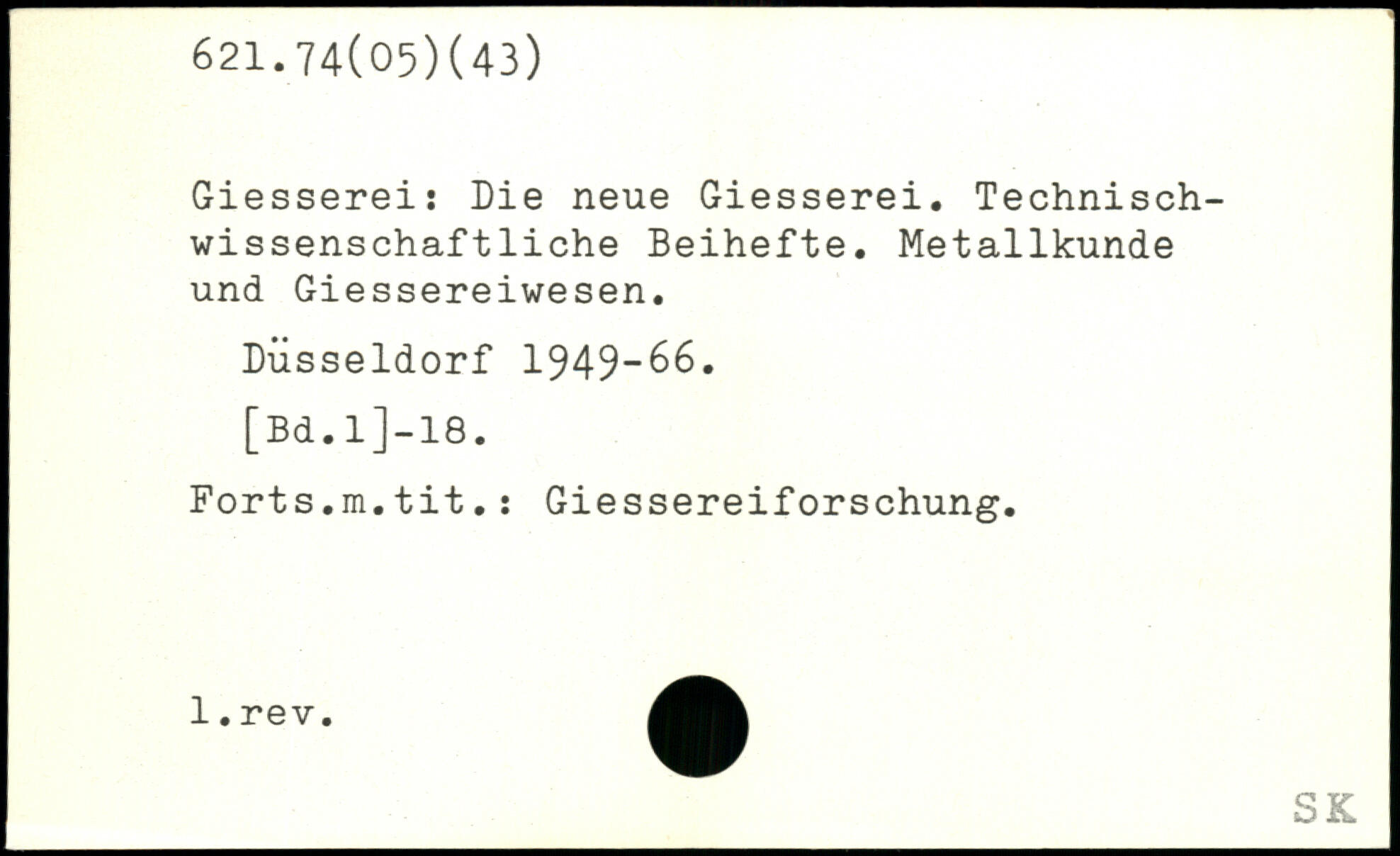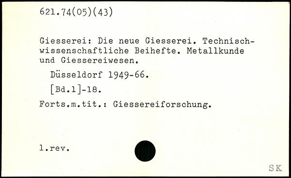 Giesserei: Die neue Giesserei. Technischwissenschaftliche Beihefte. Metallkunde und Giessereiwesen. Düsseldorf 1949-66.