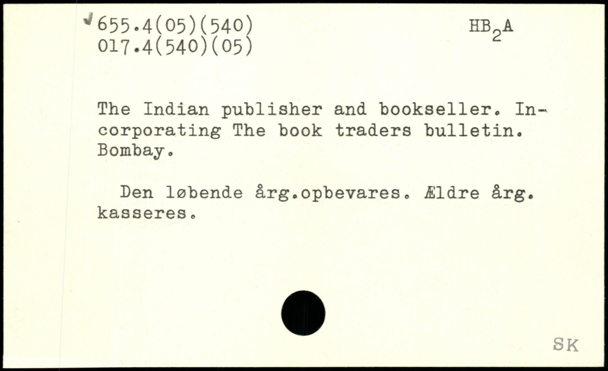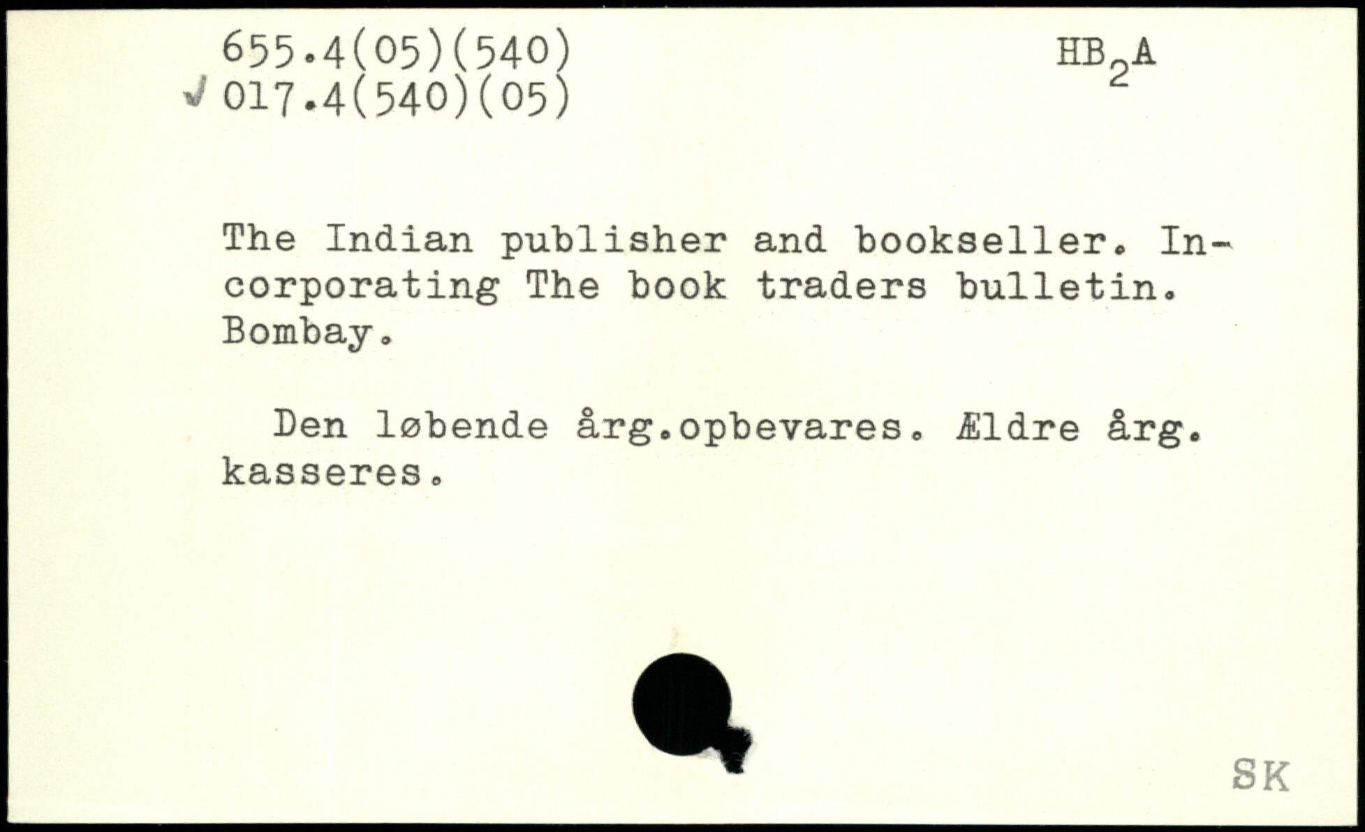 The Indian publisher and bookseller. Incorporating The book traders bulletin. Bombay. Den løbende årg.opbevares. Ældre årg. kasseres.