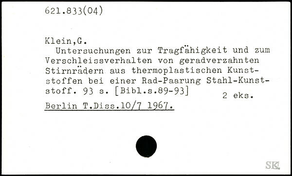 Untersuchungen zur Tragfahigkeit und zum Verschleissverhalten von geradverzahnten Stirnrädern aus thermoplastischen Kunststoffen bei einer Rad-Paarung Stahl-Kunststoff.