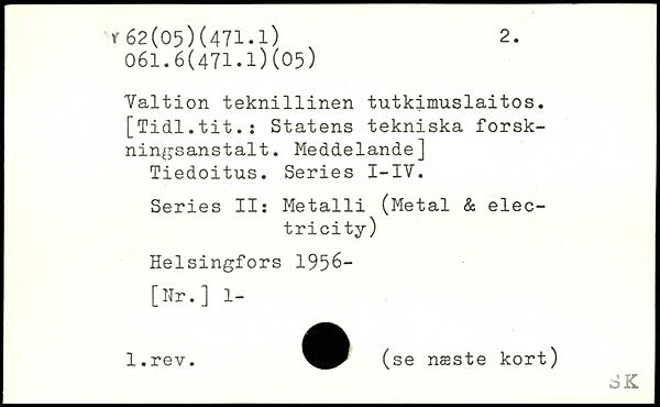 Yaltion tekn1111nen tutkimuslaitos. [Tidl.tit.s Statens tekniska forskningsanstalt. Meddelande] Tiedoitus. Series I-IV. Series II: Metalli (Metal & electricity)