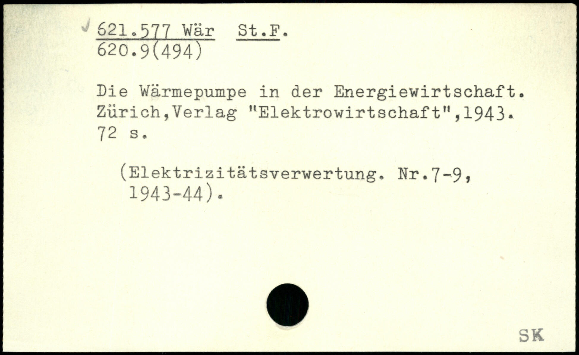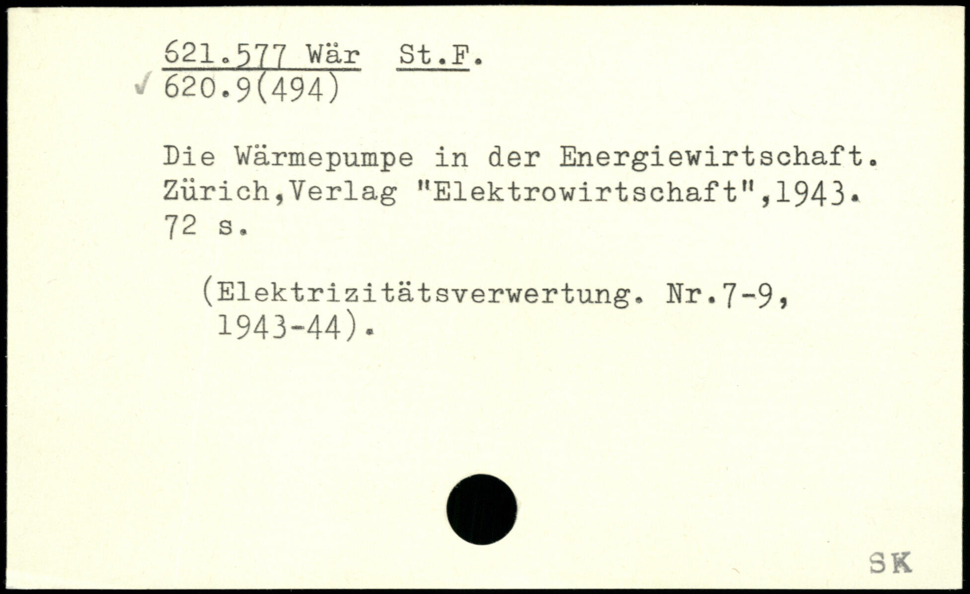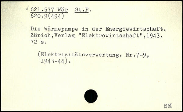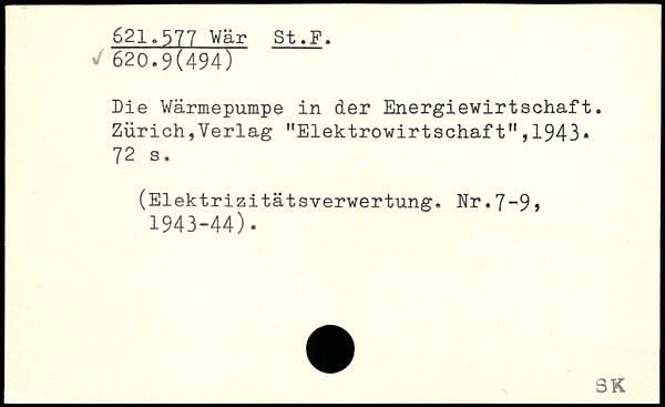 Die Wärmepumpe in der Energiewirtschaft. Zürich,Verlag "Elektrowirtschaft",1943. 72 a. (Elektrizitätsverwertung. Nr.7~9 , 1943-44).