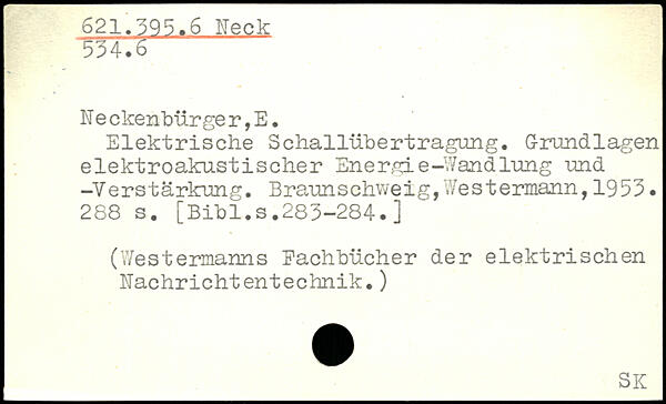 Ne ckenbürger,E. Elektrische Schallübertragung. Grundlagen elektroakustischer Energie-Wandlung und -Verstärkung.