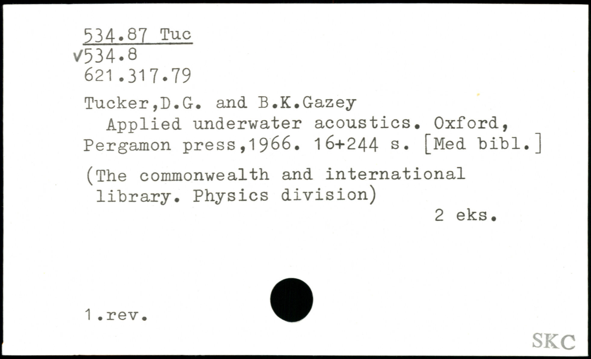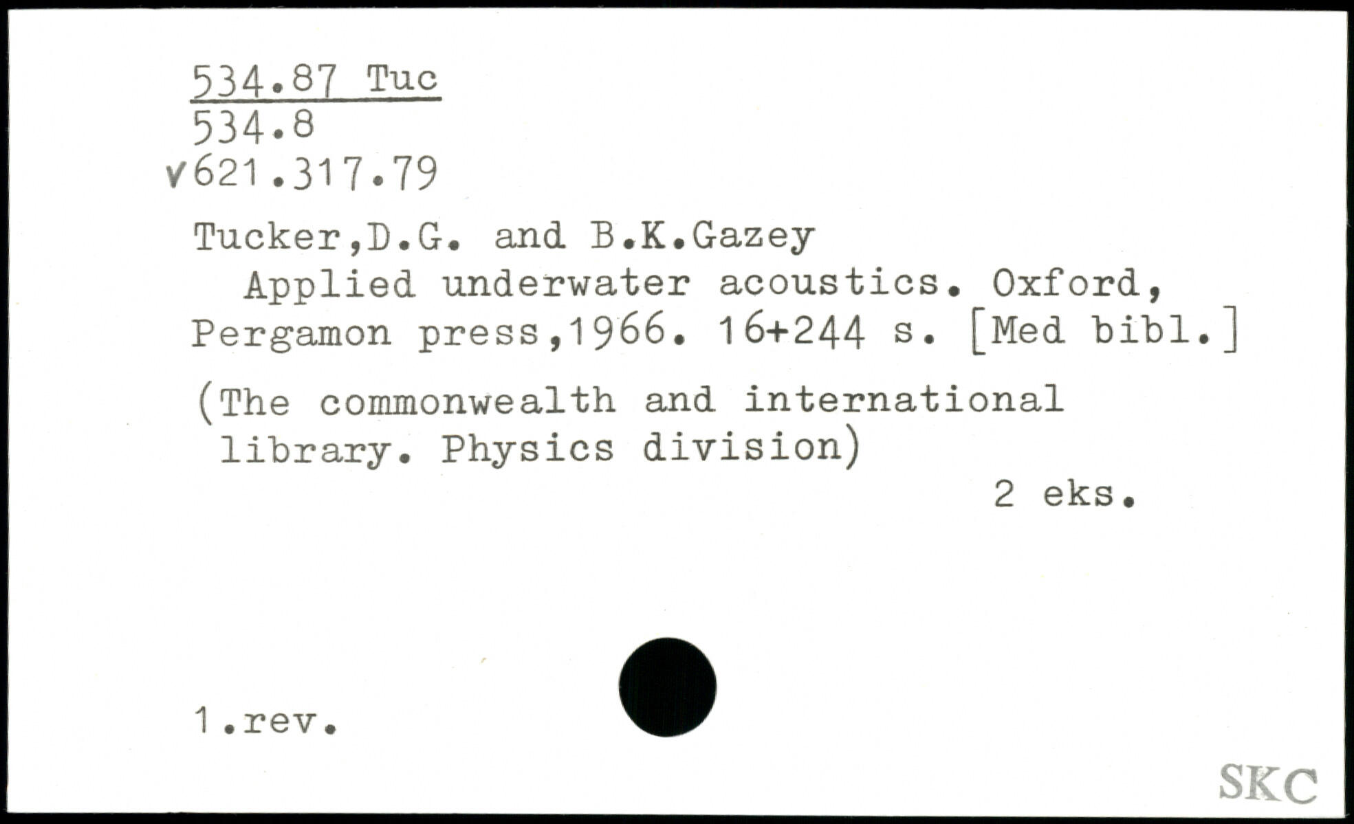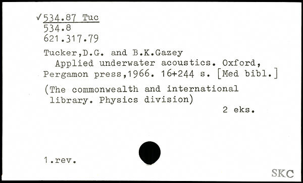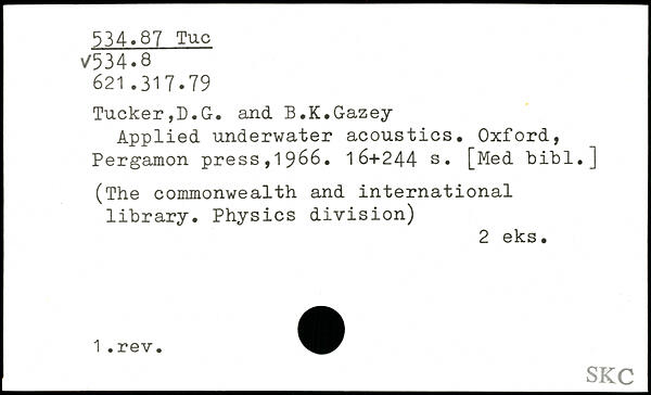 Applied underwater acoustics, Oxford, Pergamon press,1966. 16+244 s. [Med bibl.]