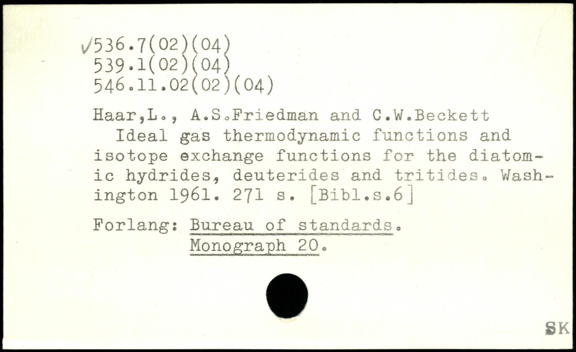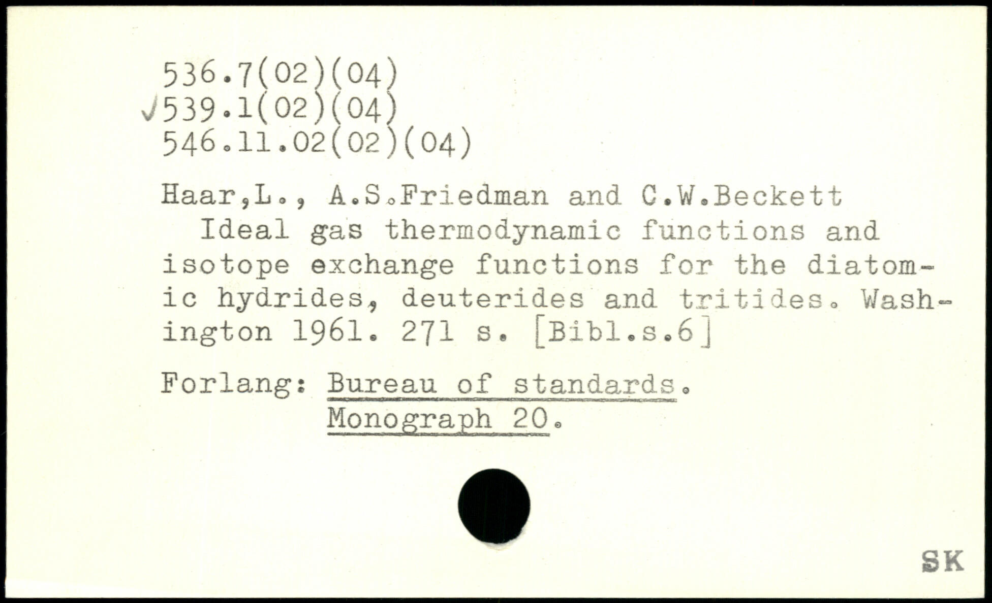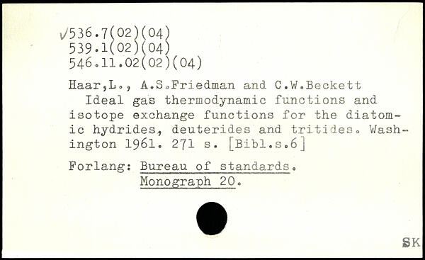 Haar,Lo? A.SoFriedman and C.W.Beckett Ideal gas thermodynamic functions and isotope exchange functions for the diatomic hydrides, deuterides and tritides