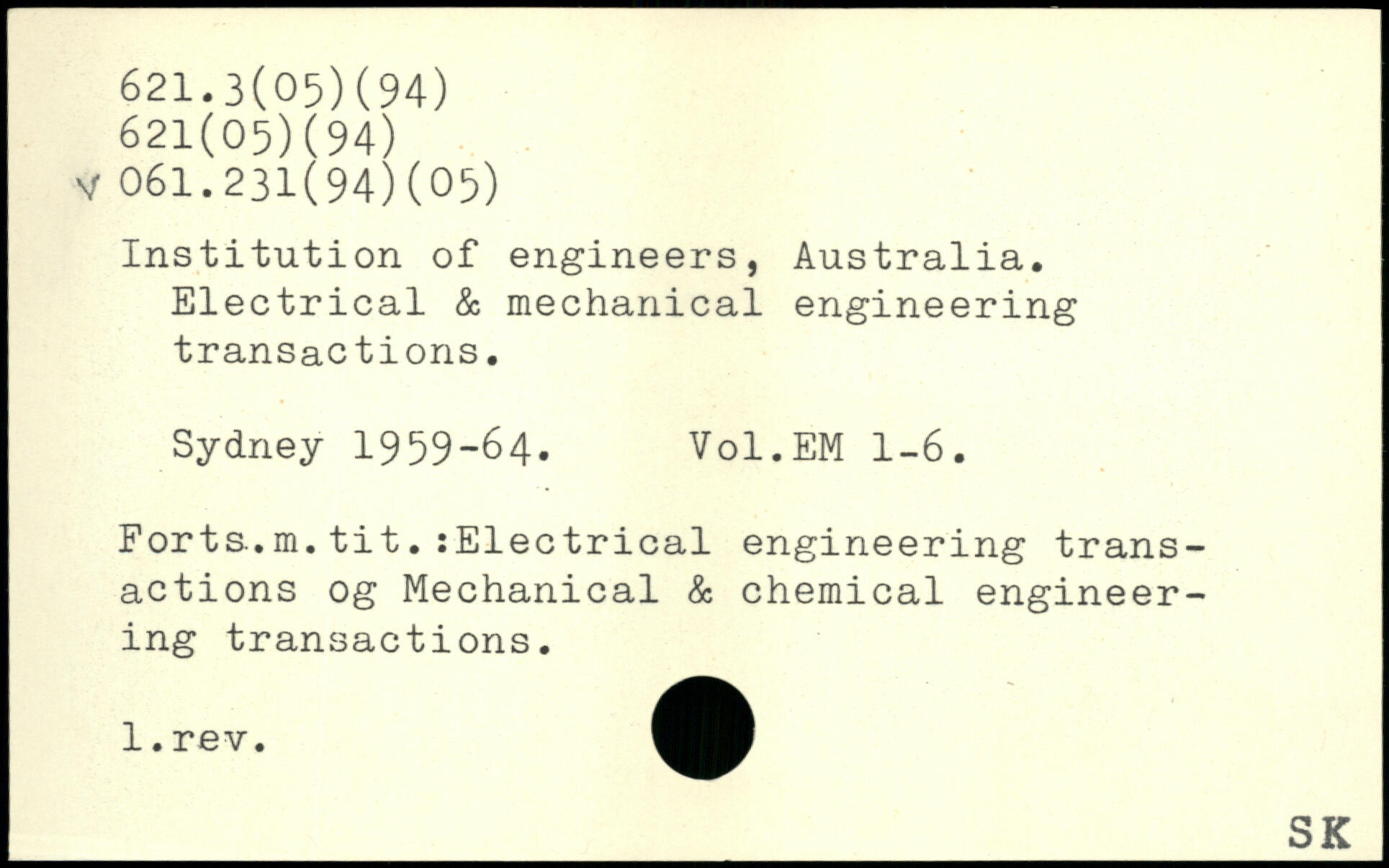 Institution of engineers, Australia. Electrical & mechanical engineering transactions. Sydney 1959-64. Vol.EM 1-6. Forts.m.tit.îElectrical engineering transactions og Mechanical & chemical engineering transactions.