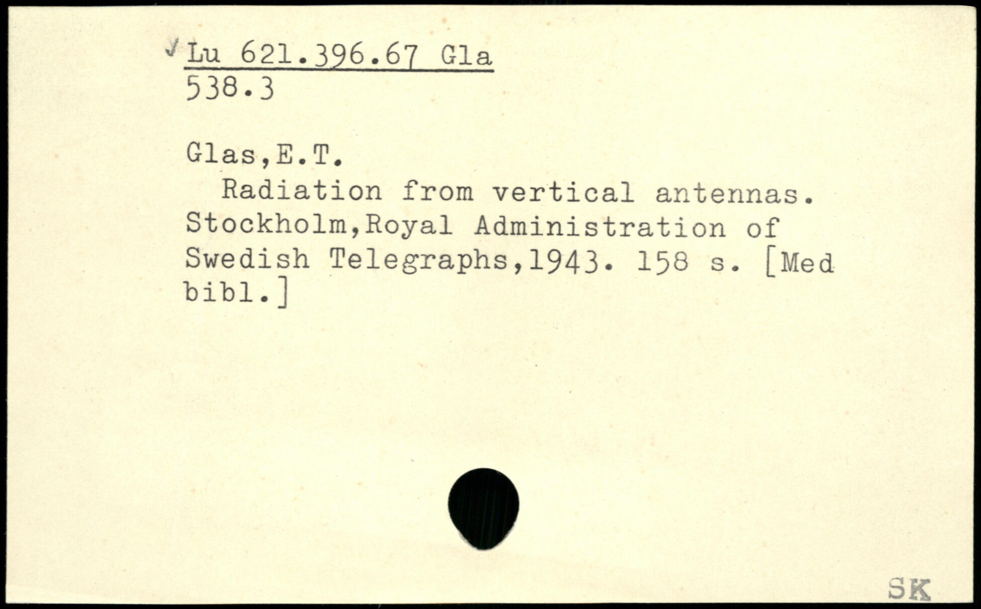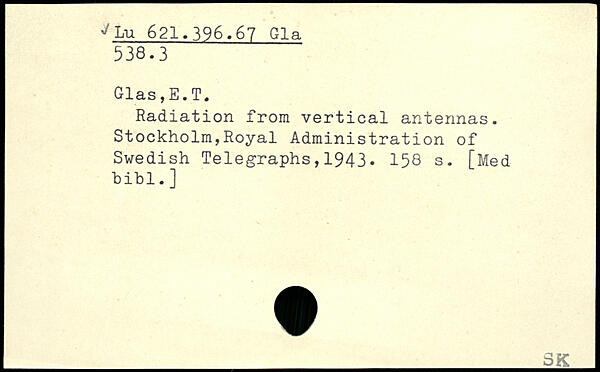 Radiation from vertical antennas. Stockholm,Royal Administration of Swedish Telegraphs,1943.