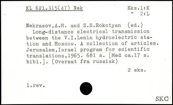 Long-distance electrical transmission between the V.I.Lenin hydroelectric station and Moscow. A collection of articles. Jerusalem,Israel program for scientific translations,1965.