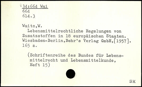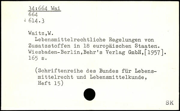 Lebensmittelrechtliche Regelungen von Zusatzstoffen in 18 europäischen Staaten. Wiesbaden-Berlin,Behr's Verlag GmbH,[1957].