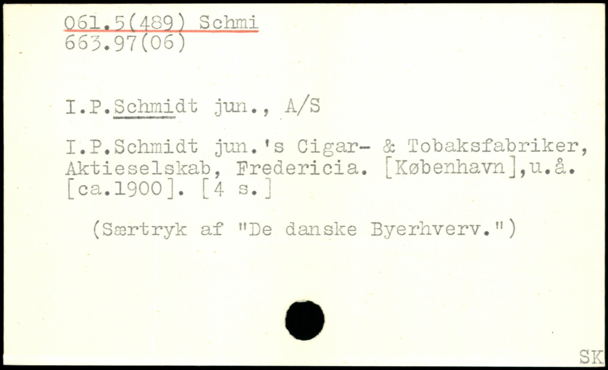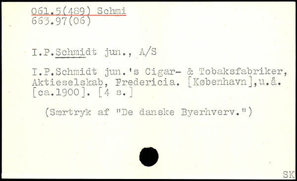 I.P.Schmidt Jun., A/S I.P.Schmidt jun.’s Cigar- & Tobaksfabriker, Aktieselskab, Fredericia.