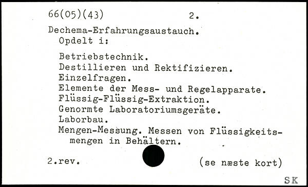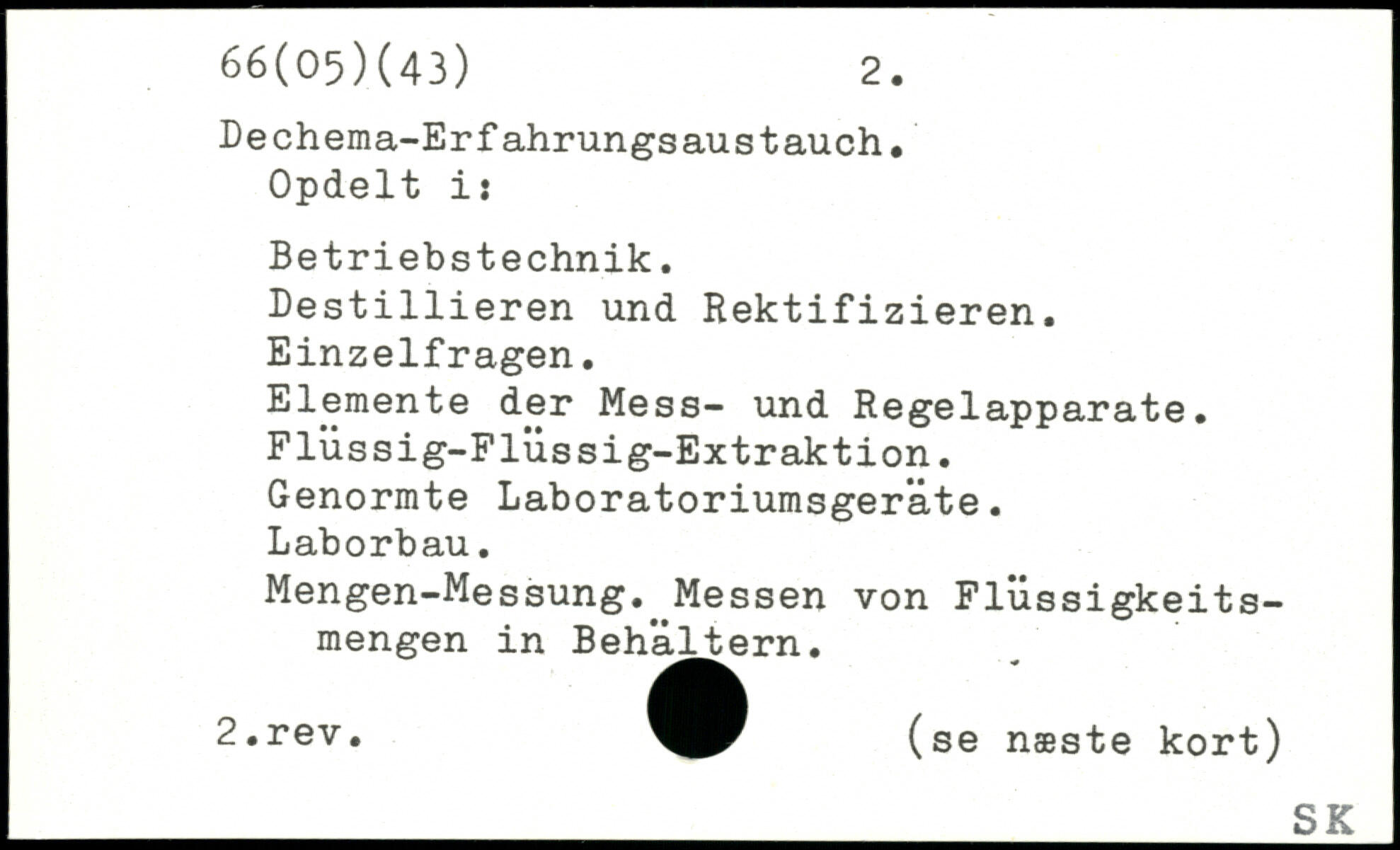 Opdelt i: Betriebstechnik. Dest1111eren und Rektifizieren. Einzelfragen. Elemente der Mess- und Regelapparate. Flüssig-Flüssig-Extraktion. Genormte Laboratoriumsgeräte. Laborbau. Mengen-Messung.^ Messen von Flüssigkeitsmengen in Behältern.