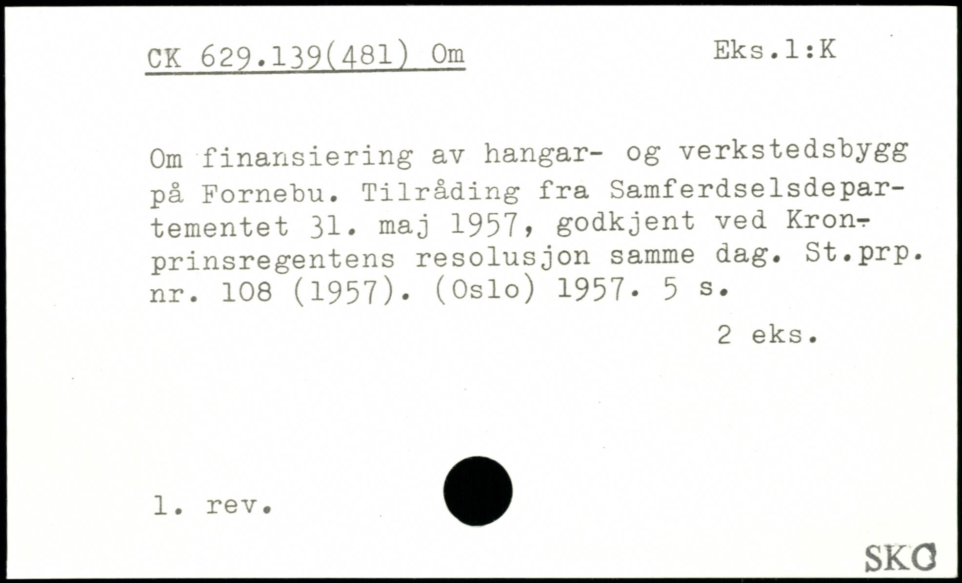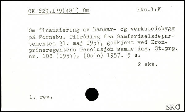 Om finansiering av hangar- og verkstedshygg på Fornehu. Tilråding fra Samferdselsdepar-tementet 31. maj 1957, godkjent ved Kron^ prinsregentens resolusjon samme dag. St.prp. nr. 108 (1957). (Oslo) 1957.